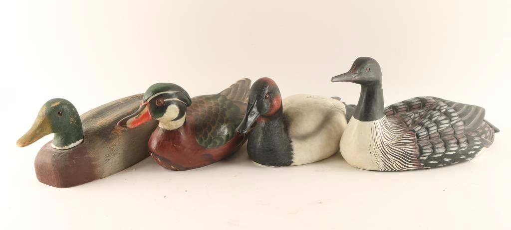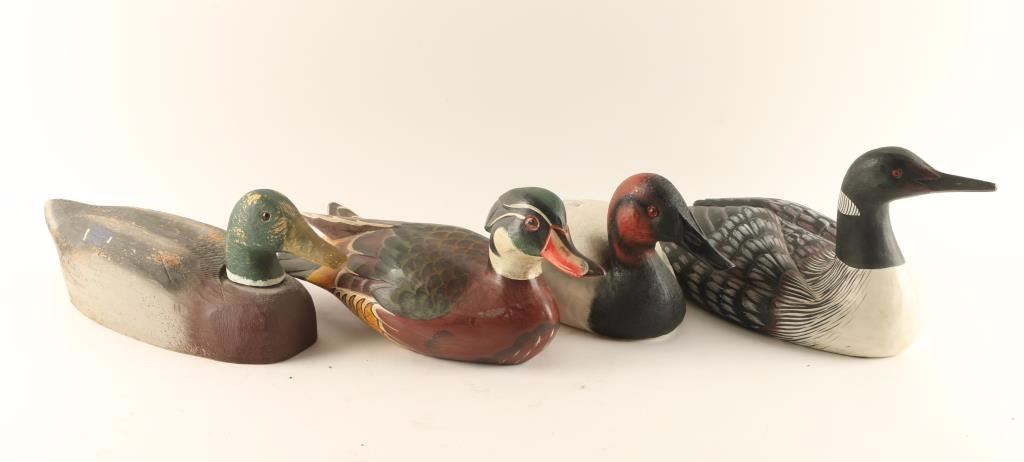 Including; a wooden hand carved and painted wood duck, wooden hand carved and painted loon, a resin redhead and a wooden mallard decoy that shows some loss to paint and age. All unsigned. Great decorators.