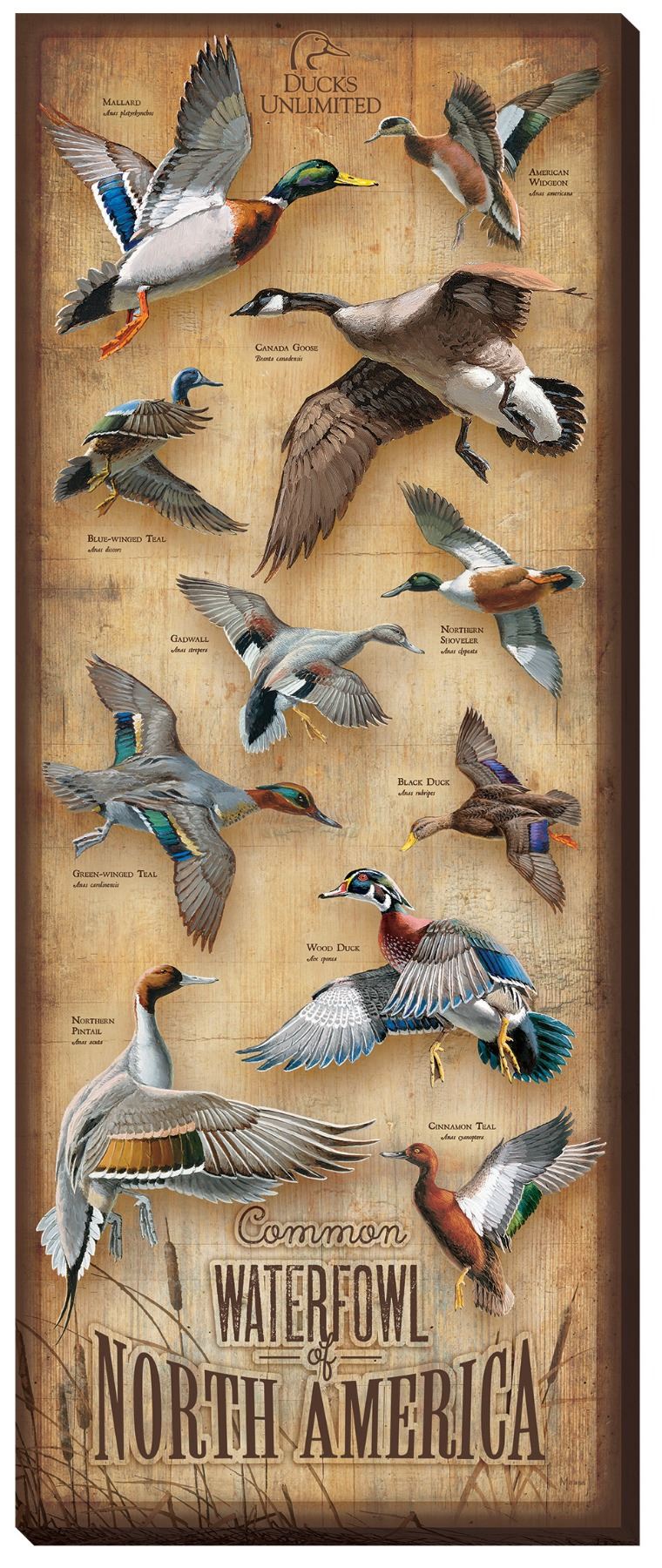 This wrapped canvas showcases common waterfowl of North America images printed on artist canvas and wrapped around wooden stretcher bars. Eleven species of waterfowl are illustrated by wildlife artist David Maass. The 30”x12” canvas includes the Ducks Unlimited logo.