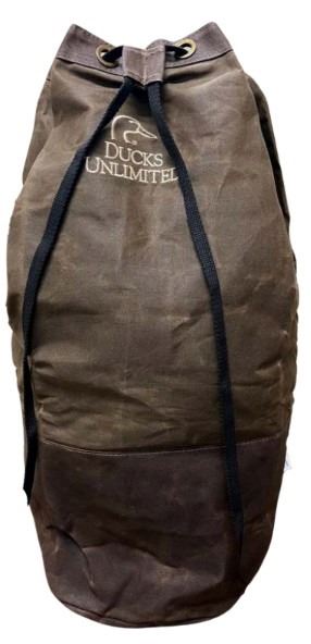 Large, waxed canvas sling pack Features embroidered DU logo and drawstring closure and brass hardware | Single adjustable strap | Perfect for a laundry bag or carrying Measures 24” x 13