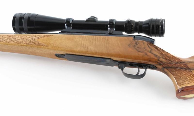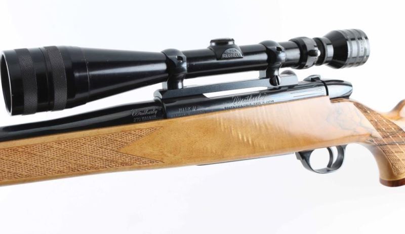 Bolt action rifle made in Japan, imported by Weatherby, South Gate CA. Features blued finish, English walnut stock with fancy figure in butt & around action, 24" barrel, no sights, one piece Redfield scope base & rings, manual safety on right side of bolt shroud, sling studs, ventilated rubber recoil pad. Stock is Monte Carlo styled with contrasting grip cap & forend tip, white diamond inset on grip cap, curved grip, high combed right hand cheek piece, checkered panels at wrist & forend. Bore is excellent condition. Retains 98% blue with handling marks. Barrel appears to have a small amount of varnish or shellac or similar on top surface above forend, hard to see, might clean off with a gun cleaning solvent. Stock is excellent condition. Mounts a good condition Redfield 4-12x scope with adjustable objective, range finding reticle, clear optics. Condition is NRA Excellent *** Modern Firearm ***