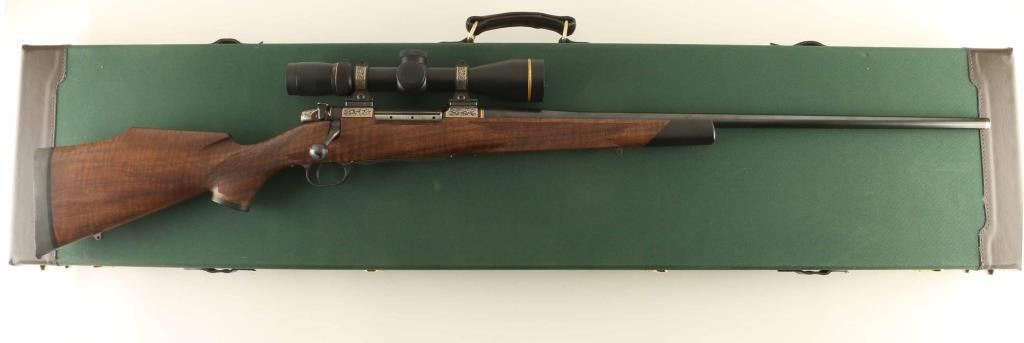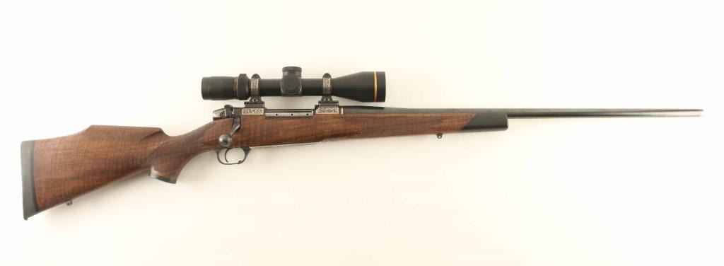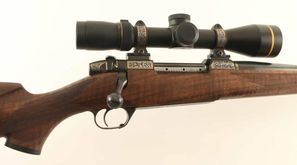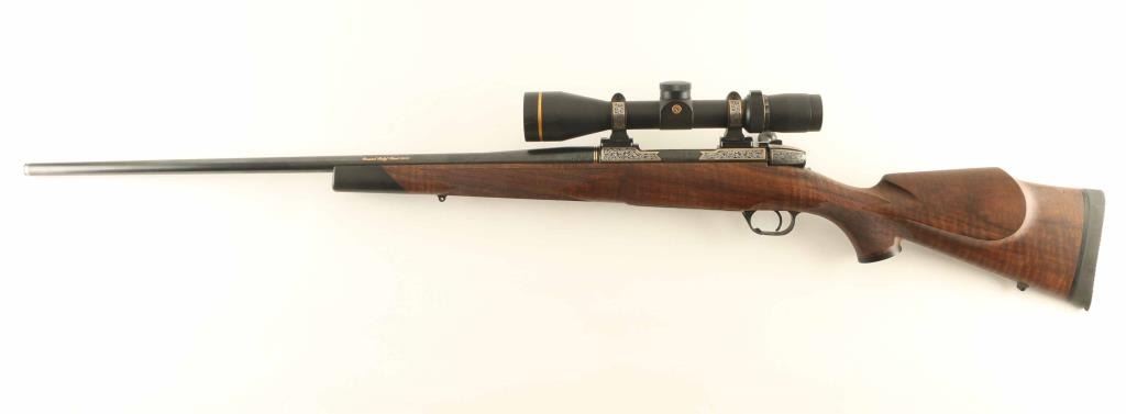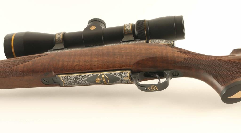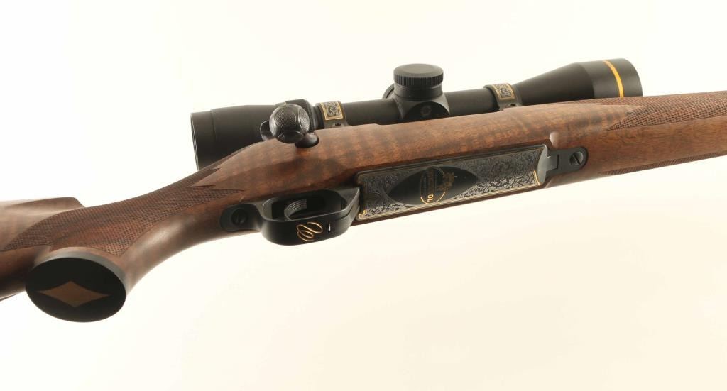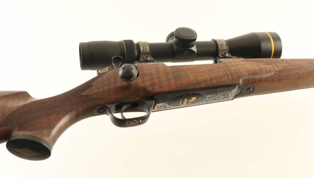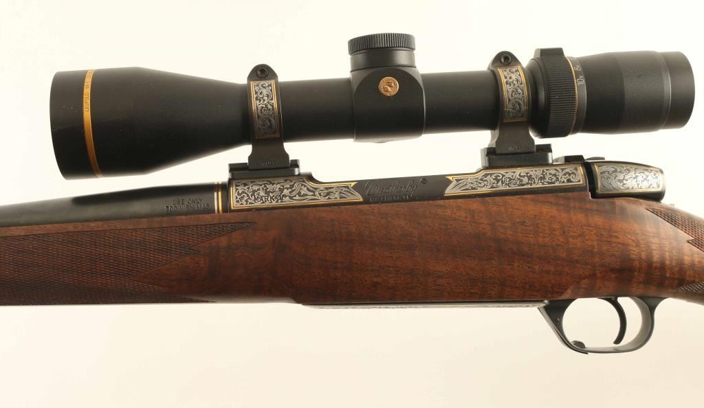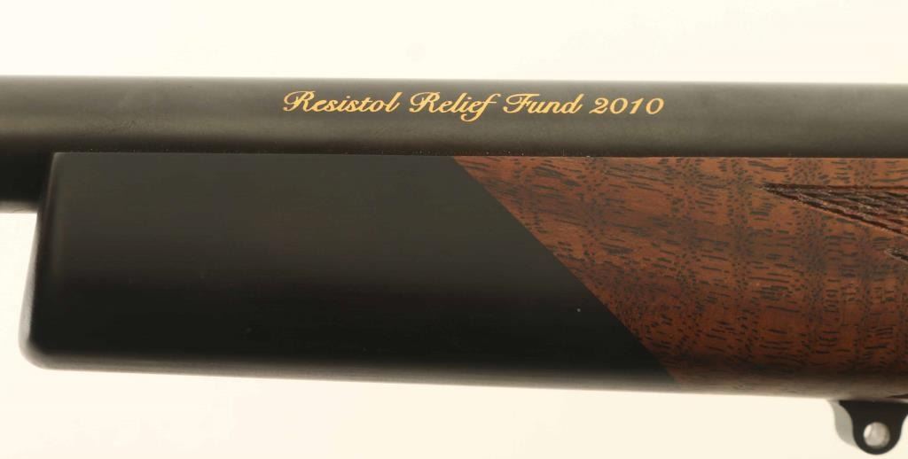 Resistol Rider Relief Fund 2010 Commemorative - magnum bolt action rifle features matte blued finish, exhibition grade Claro walnut stock, 26" barrel, manual safety. Action features floral scrolls relief engraved on top of receiver and on floor plate, with gold wire inlaid borders and gold inlay Weatherby "W" on triggerguard. Center of magazine floorplate has gold inlaid "RESISTOL" and rampant bull logo. Bolt body and magazine follower have damascened finish. Barrel has paired silver and gold wire inlaid rings at breech and muzzle, Talley rings match the receiver with engraved panels on sides and mount a Leupold VX-7 2.5-10x45mm scope. Stock features American classic styling, with ebony tip, ebony grip cap with contrasting off-white inlaid diamond, right handed cheekpiece, inlaid European style swivel studs, solid rubber recoil pad, multi point checkering on sides of wrist and forend, high satin hand rubbed oil finish. Includes high quality green velvet cloth covered and lined Weatherby case, with leather end wrap, locking latches, leather securing straps. owners manual and factory order sheet. All items are like new condition. Condition is NRA Excellent - Like New *** Modern Firearm ***
