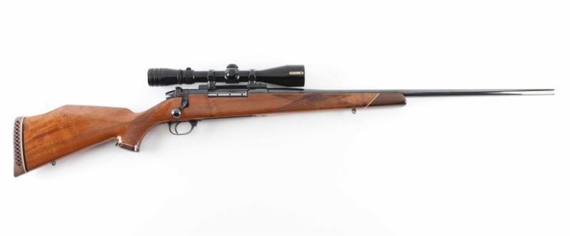 Bolt action rifle made in Japan, imported by Weatherby, South Gate CA. Features blued finish, nicely walnut stock, 26" barrel, no sights, one piece Redfield type scope base & rings, manual safety on right side of bolt shroud, sling studs, ventilated rubber recoil pad. Stock is Monte Carlo styled with contrasting grip cap & forend tip, white diamond inset on grip cap, curved grip, high combed right hand cheek piece, checkered panels at wrist & forend. Bore is excellent condition. Retains 98% blue with handling marks. Stock is very good condition with several blemishes to the urethane finish on the butt. Mounts a very good condition Redfield "Illuminator" 3-9x scope with duplex reticle, clear optics. Condition is NRA Very Good++ *** Modern Firearm ***