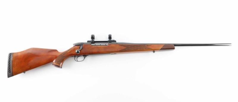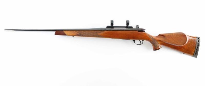 Bolt action rifle made in Germany. Features blued finish, fancy figured walnut stock, 24" barrel, no sights, one piece Redfield scope base & rings (no scope provided), manual safety on right side of receiver upper tang, sling studs, ventilated rubber recoil pad. Stock is Monte Carlo styled with contrasting grip cap & forend tip, contrasting diamond inset on grip cap, curved grip, high combed right hand cheek piece, checkered panels at wrist & forend. Bore is excellent condition. Retains 97% blue with handling marks, some bare metal beginning to show on edges of floorplate. Stock is very good condition with few minor blemishes. Condition is NRA Excellent *** Modern Firearm ***