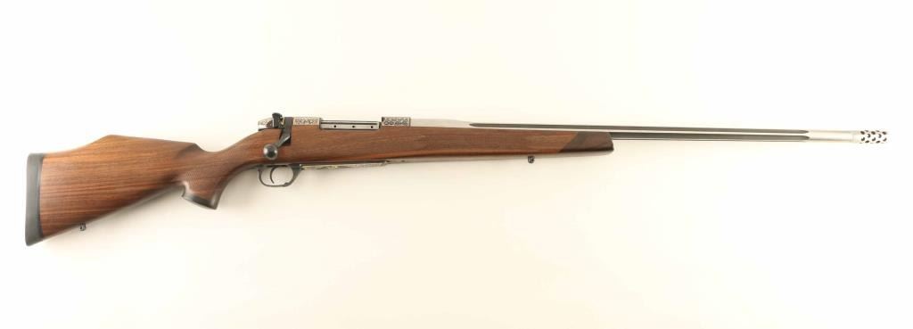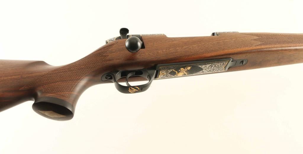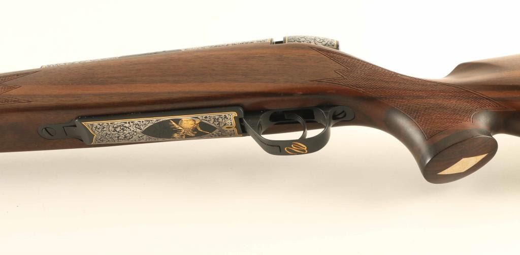 SN: PB045484 Bolt action rifle features blued action with fancy engraving and metal inlay, two tone color 26" fluted barrel (silver/stainless with darkened flutes), muzzle brake, hinged floorplate, manual safety. Monte Carlo stock with right handed cheekpiece, solid rubber recoil pad, sling studs, checkered panels at wrist & forend, contrasting wood forend tip & grip cap. Bore is excellent. Engraving consists of contrasting silver & black inlaid floral scrolls surrounded by gold wire inlaid borders, located at: receiver sides, cocking piece sides & top, floorplate. Floorplate adds an inset gold inlay Moose. Triggerguard bow has gold inlay cursive "W". Overall external appearance is excellent with few signs of handling, few small scrapes to stock near trigger. Includes factory box with factory test target. Condition is NRA Excellent *** Modern Firearm ***
