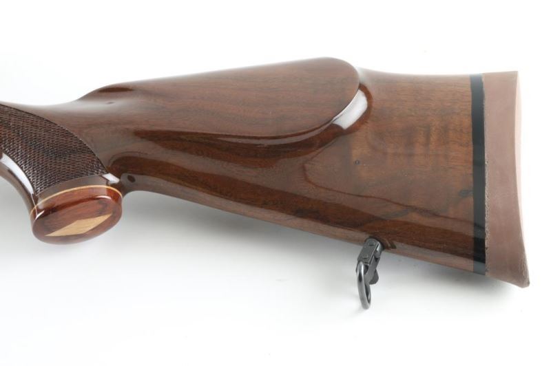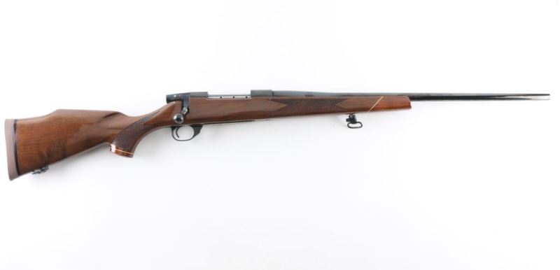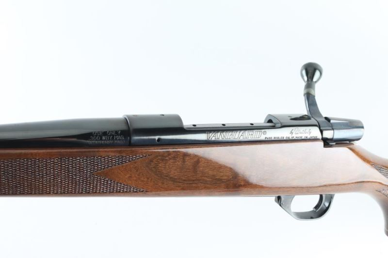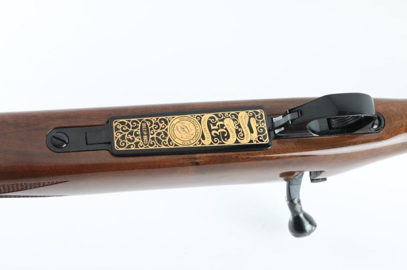 '288 of 2700 National Wild Turkey Federation' Japanese made bolt action rifle, imported by Weatherby, Paso Robles CA. Features blued finish, urethane finished wood, 24" barrel, no sights, drilled & tapped receiver, hinged floorplate, manual safety, solid rubber recoil pad, sling studs (with detachable swivels), checkered panels at wrist & forend, right hand cheek piece, curved grip stock, contrasting wood forend tip & grip cap. Wood is fancy figured walnut. Bore is very good condition. Retains 95% finish with handling marks. Stock is excellent condition. Floorplate features gold color scroll pattern, National Wild Turkey Federation logo, "35 Years of Conservation". Bolt knob retains protective plastic shipping sleeve. Condition is NRA Excellent *** Modern Firearm ***