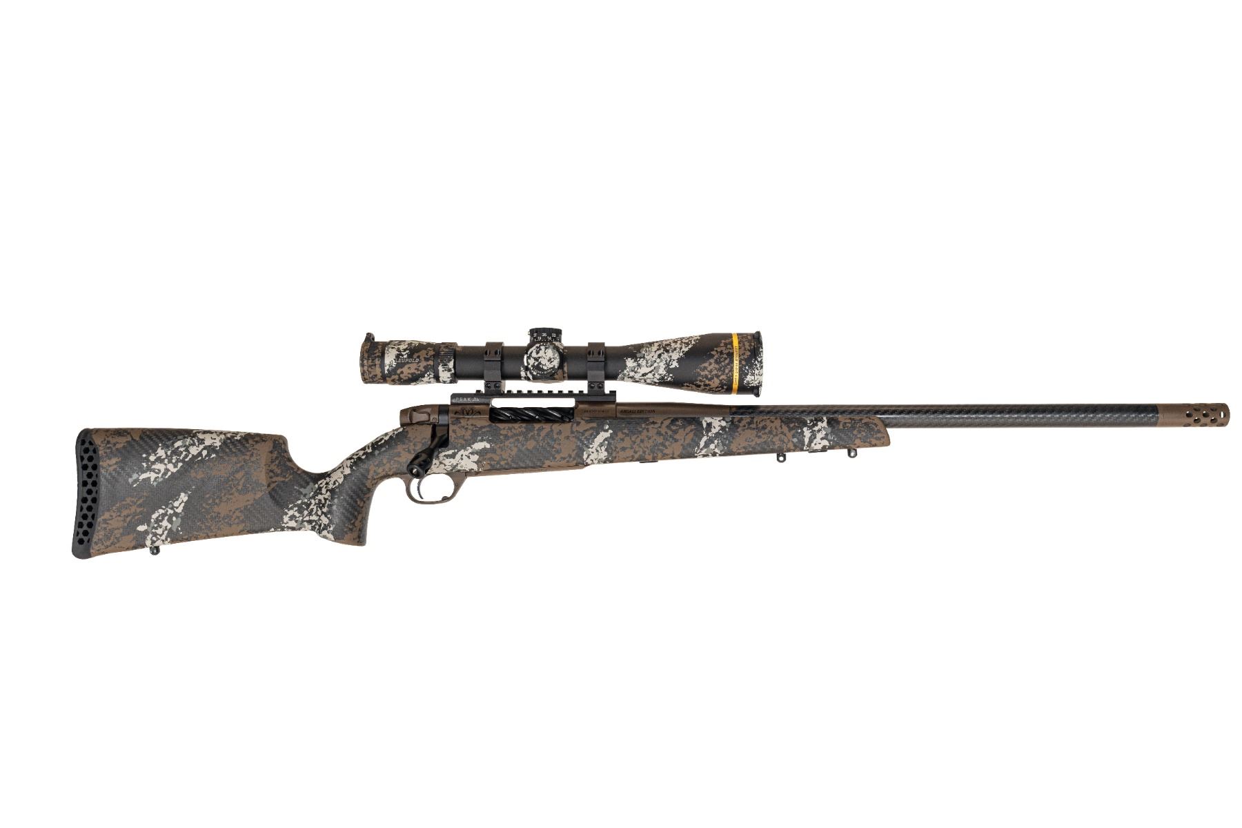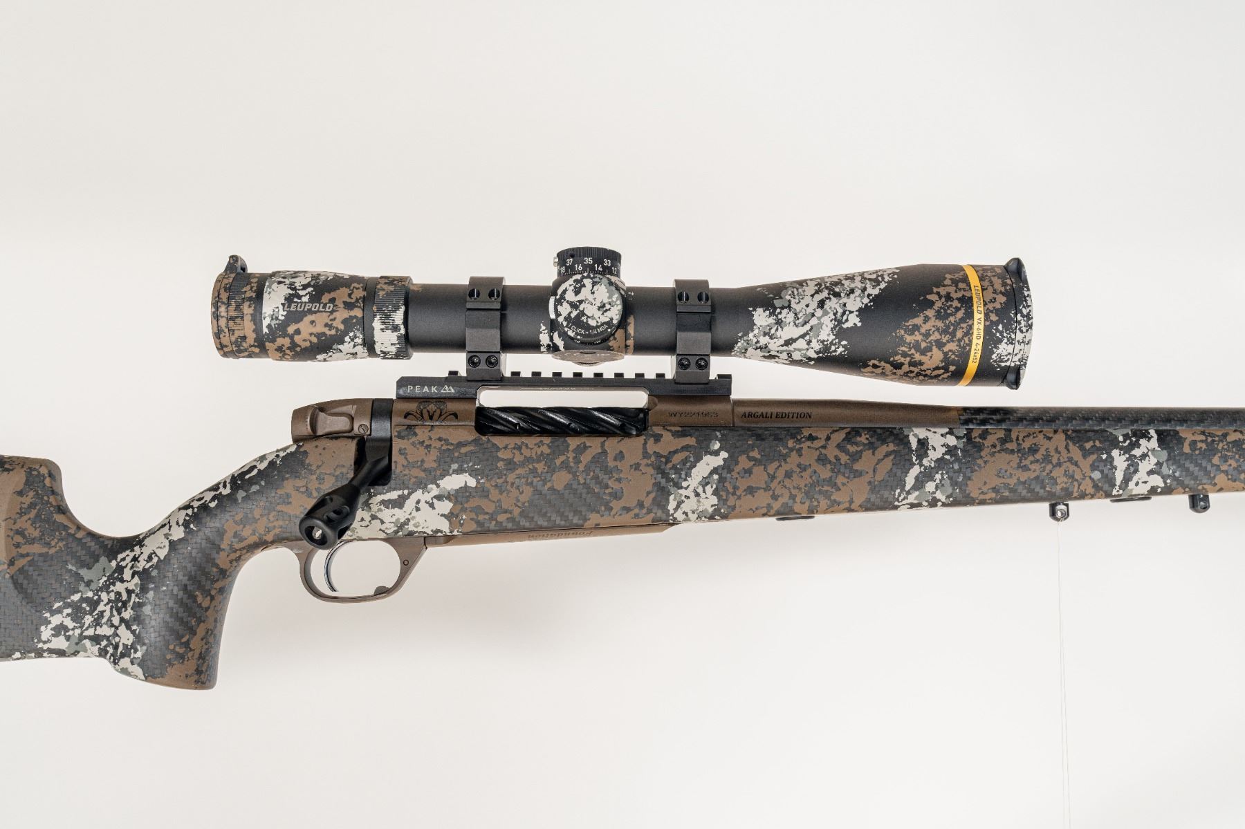 Perfect for the discerning mountain hunter, the Argali Edition features Weatherby’s exceptional and lightweight Backcountry Ti Titanium Mark V® action, with Cerakote protection bedded into a custom Peak 44 carbon fiber Bastion stock sporting a WSF-only paint scheme. A user adjustable Triggertech hunting trigger ensures the owner can make that first shot count on this sub- MOA guaranteed platform. The stock also features factory installed Spartan accessory adapters as well as twin swivel studs. A precision BSF carbon barrel with custom titanium muzzle break is mated to the action and is treated in stock and action color- matching Cerakote. A stunning Altai Argali skull on the action, “Argali Edition” on the chamber, and a WSF logo floorplate complements this custom rifle beautifully.