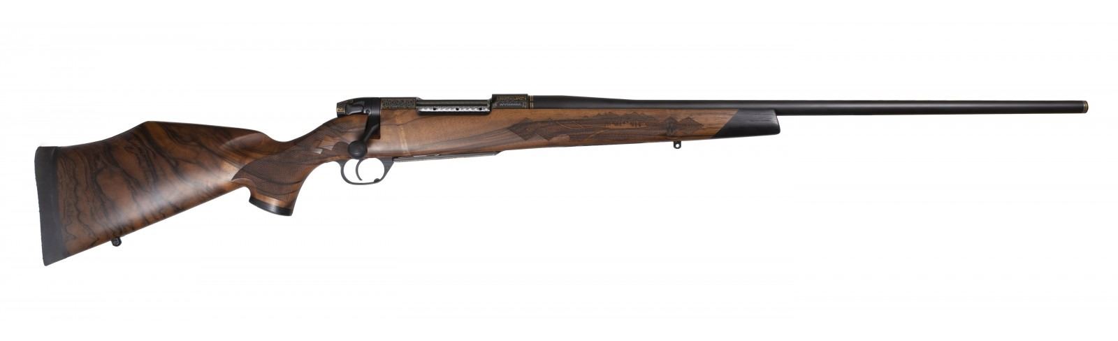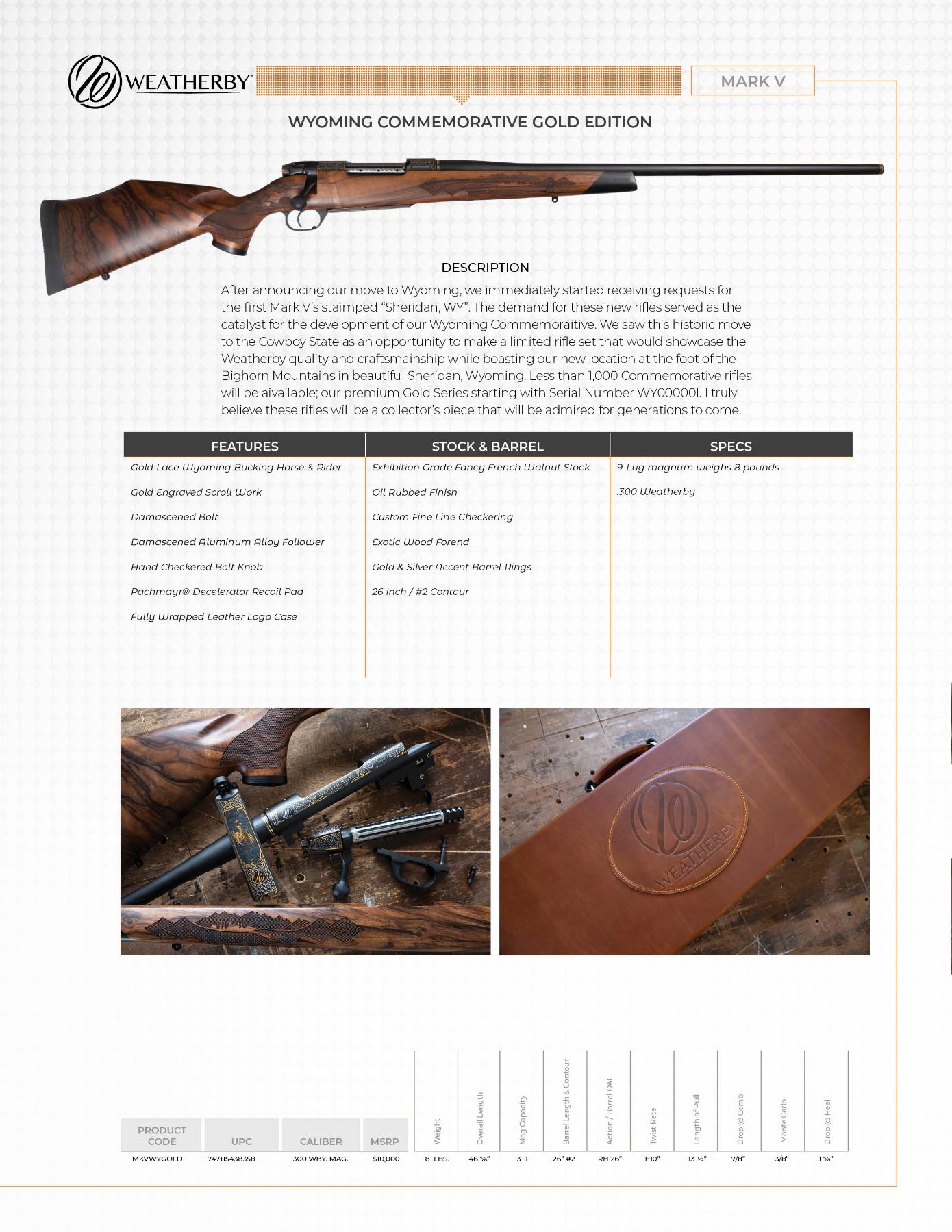 Weatherby has provided a Mark V, with Serial Number 004 of 200, Wyoming Commemorative Gold Edition Rifle Chambered for .300 Weatherby. “After announcing our move to Wyoming, we immediately started receiving requests for the first Mark V’s stamped “Sheridan, WY”. The demand for these new rifles served as the catalyst for the development of our Wyoming Commemorative. We saw this historic move to the Cowboy State as an opportunity to make a limited rifle set that would showcase the Weatherby quality and craftsmanship while boasting our new location at the foot of the Bighorn Mountains in beautiful Sheridan, Wyoming. Less than 200 Commemorative rifles will be available in our premium Gold Series starting with Serial Number WY0000O1. I truly believe these rifles will be a collector’s piece that will be admired for generations to come.”