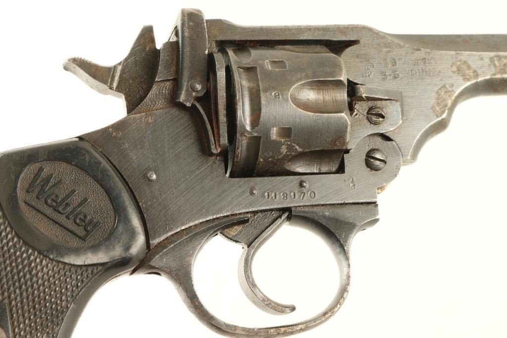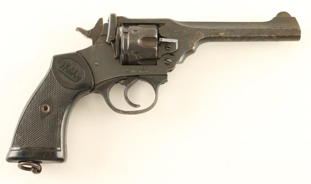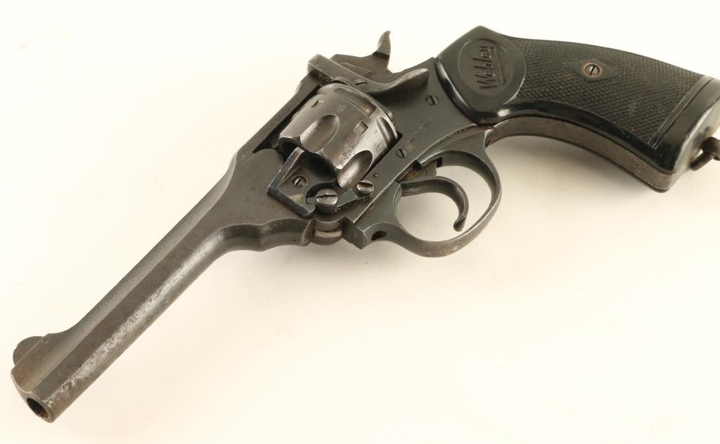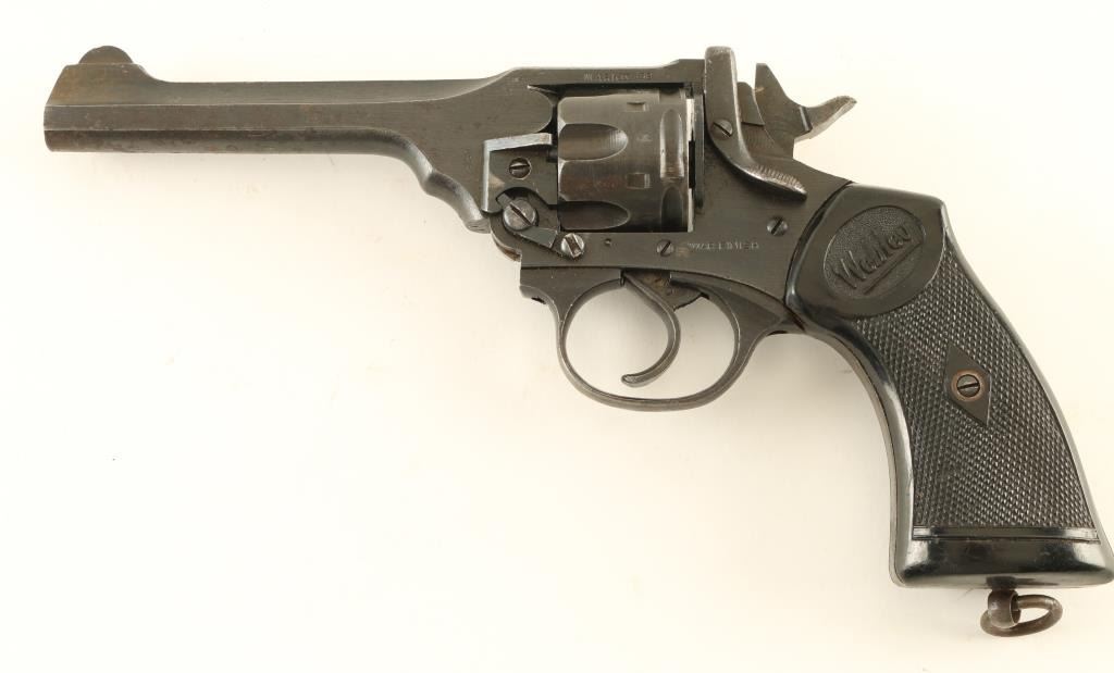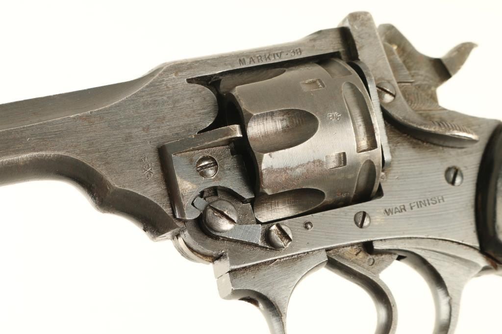 British military revolver features double/single action operation, blued finish, black plastic grips, 5” barrel, top break with automatic ejection, lanyard ring at butt. Bore and cylinder charge holes are in very good condition. Retains 80% finish on metal parts, with bare metal on sharp edges, areas of patina or pitting on barrel & cylinder. Action is smooth with tight lock-up. Marked “WAR FINISH” on left side. Condition is NRA Good+ (as refinished) *** C&R Firearm ***
