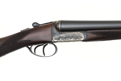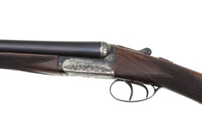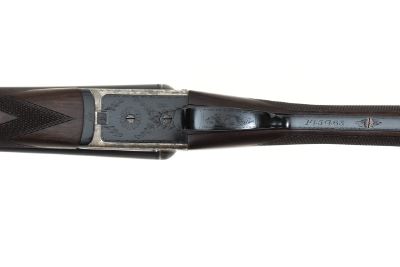 The case-colored action is beautifully engraved in foliate scroll across both sides and the blacked underside, paired with a blued, engraved trigger guard that protects double triggers and an Anson-style splinter fore-end with push-button release.