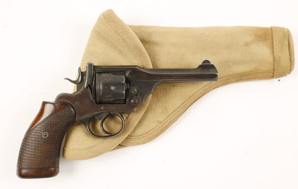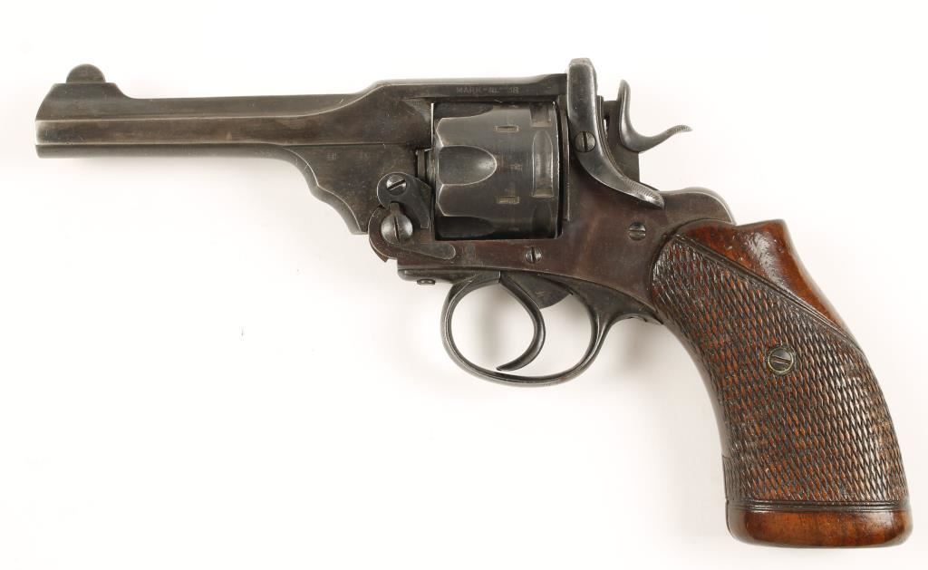 Blued double-action top-break 6-shot revolver with a 4" barrel. Finish is fading into plum with isolated spots of surface rust. British proofs but no martial proofs. The bore is dirty with rifling and the chambers are dirty. The wood grips are checkered, worn and are in good condition. Overall condition is good. *Modern Firearm*