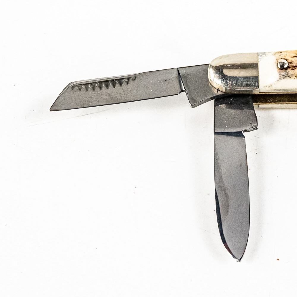 Weidmannsheil Solingen Germany made pocket knife. Excellent high quality stag handle with nickel bolsters.3 blade whittler/stockman style knife is like new with only storage wear on bolsters. Older hand-made knife is excellent collector or gift item. 3.2" closed length. See photos.