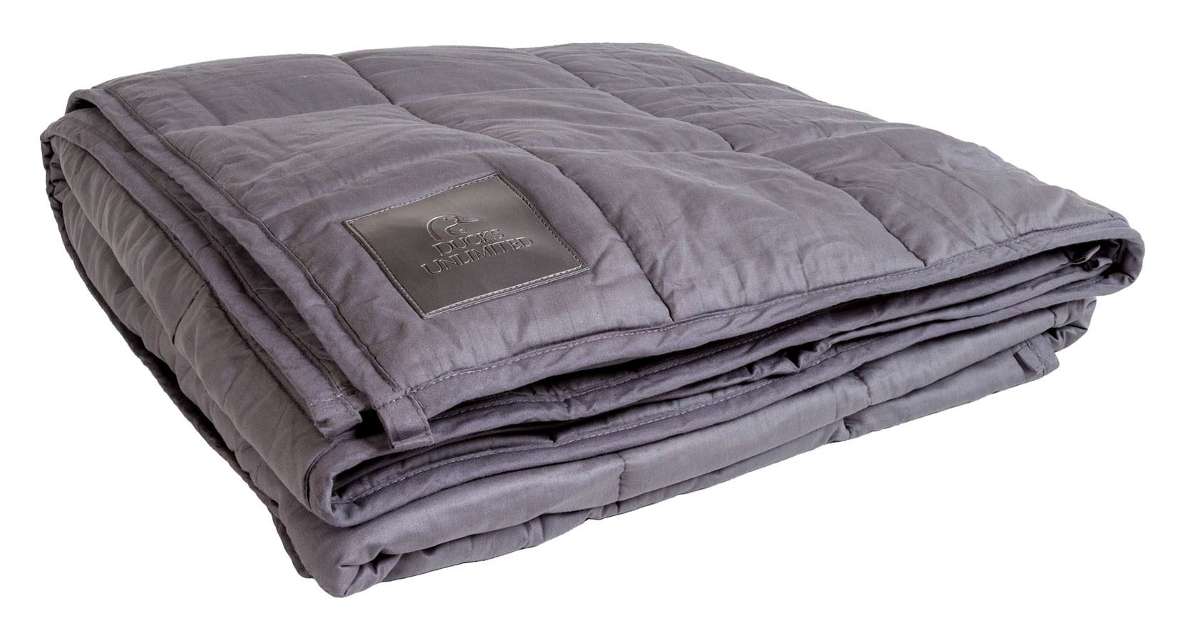 This dark gray weighted blanket is sure to relax anyone. They are said help to promote stress relief, reduce anxiety and provide better sleep. This blanket is made of 5-layer cotton twill with cotton and class bead filling. It features a gray faux leather patch with the vertical Ducks Unlimited logo in the lower corner. It weighs 15 lbs. and is not for use with children. Overall dimensions are 58”x 77 ½.”