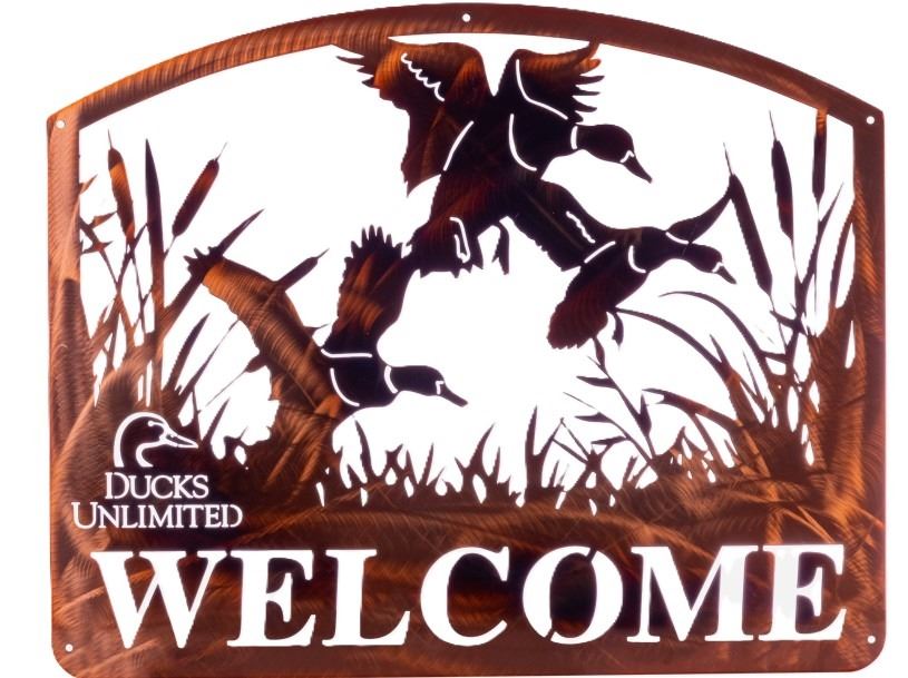 The Welcome Sign is a striking piece of craftsmanship that adds a warm and distinguished touch to any entrance. Expertly created with precision laser-cut technology, it features an elegant design of flying ducks alongside the Ducks Unlimited logo. Constructed from durable 14-gauge steel, the sign is finished with a rust patina powder coat and a high-gloss protective coating to ensure lasting beauty and resilience. Measuring 29” x 23.25” and proudly made in the USA, this welcome sign is the perfect blend of artistry, durability, and Ducks Unlimited tradition.