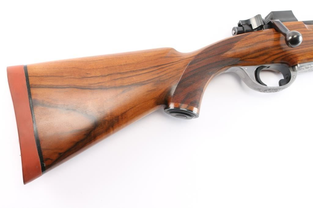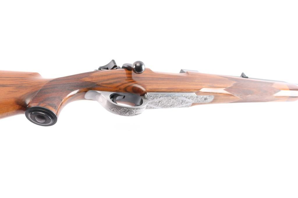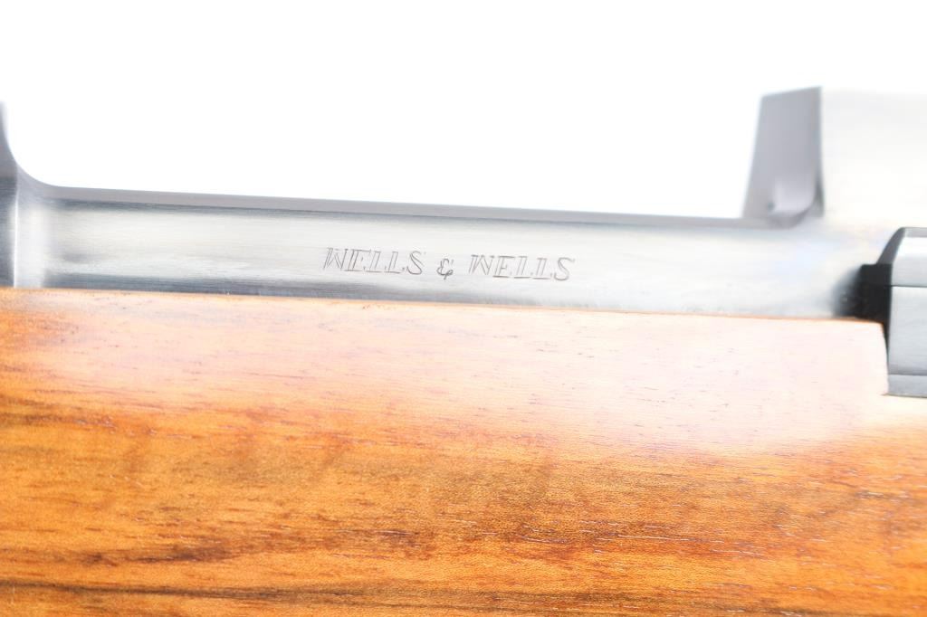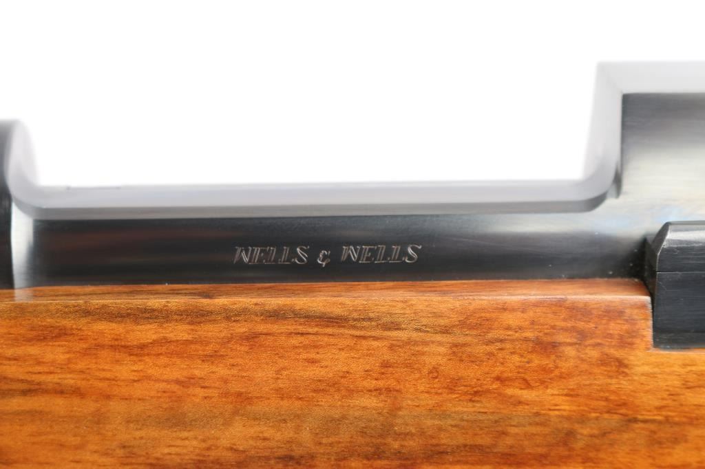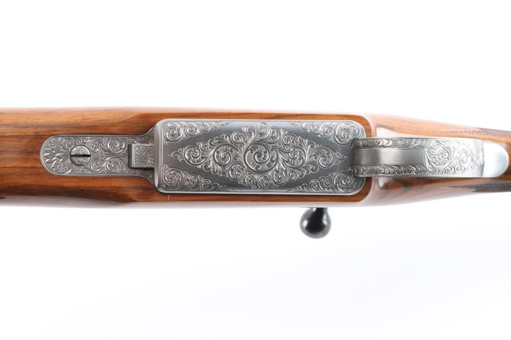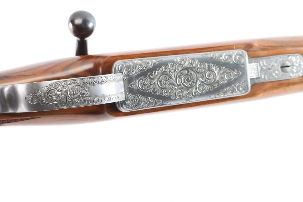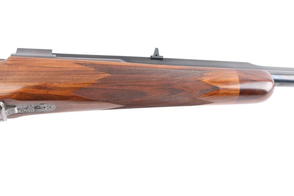Absolutely massive, custom 22%-oversized double square bridge magnum Mauser bolt action rifle. All custom made, with components made to scale, at proportional sizes. Made by Fred Wells, bottom metal engraved by FEGA Master Engraver Rachel Wells. Barrel is 27.5", overall length is 50" with 14-3/8" LOP, weight is 20.25 pounds. Features blued finish, deluxe walnut stock, two position side swing safety on bolt shroud. Barrel has an integral full length rib, with single leaf express sight and Partridge style front sight blade, sling stud mid-barrel. Top of rib is matted, with thin smooth borders. Stock is fancy figure walnut, semi pistol grip with cheek pieces, contrasting tip, steel grip cap. Bright metal bottom metal has hinged floor plate, drop box design, beautiful even Nimschke style floral scroll engraving. Condition is like new, with pristine bore, 98% finish showing minor handing marks, few blemishes to wood.