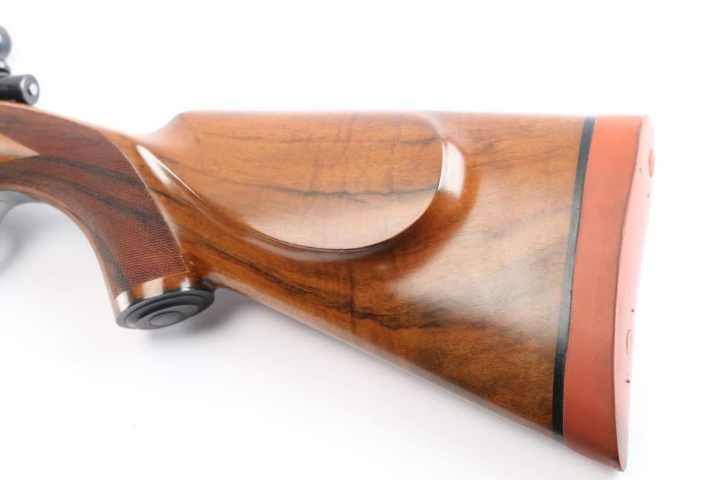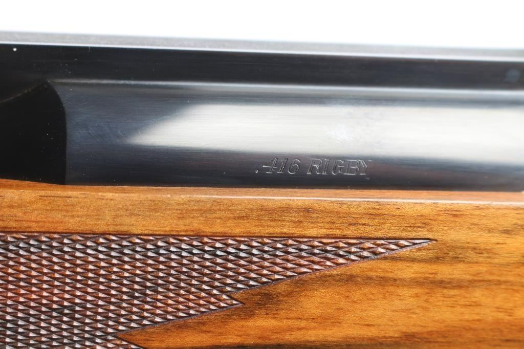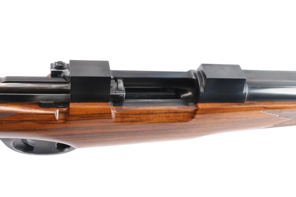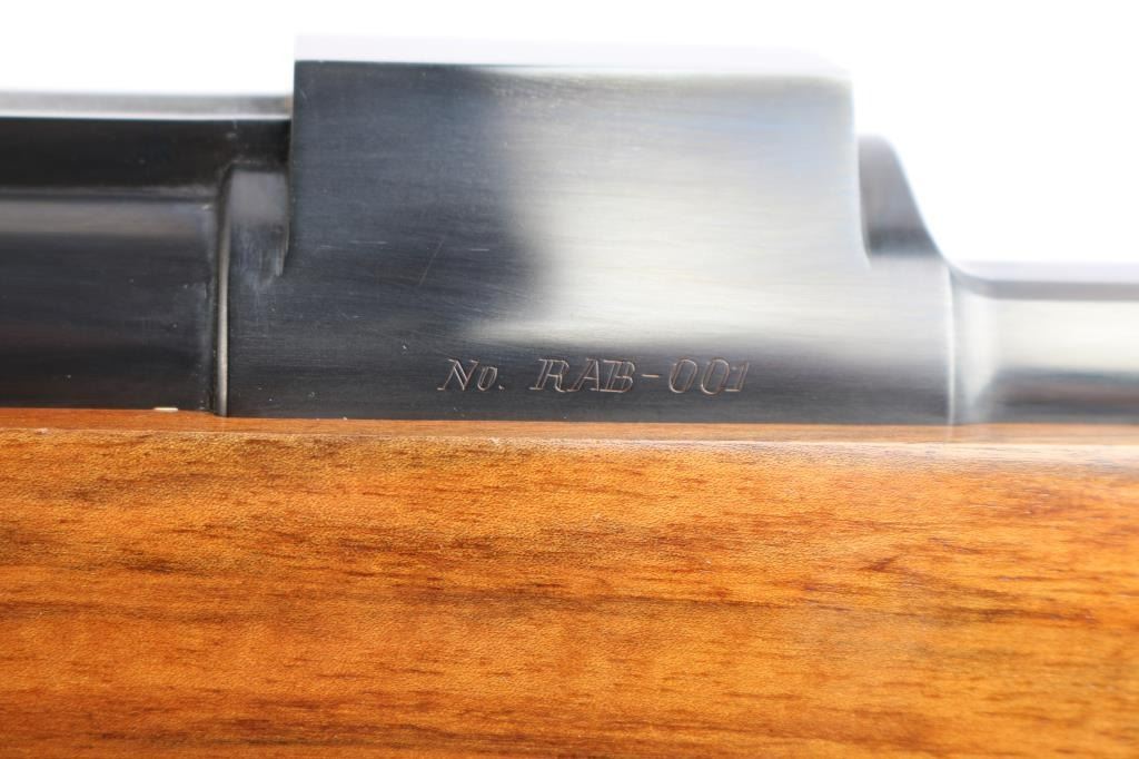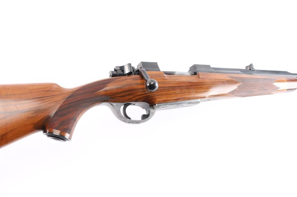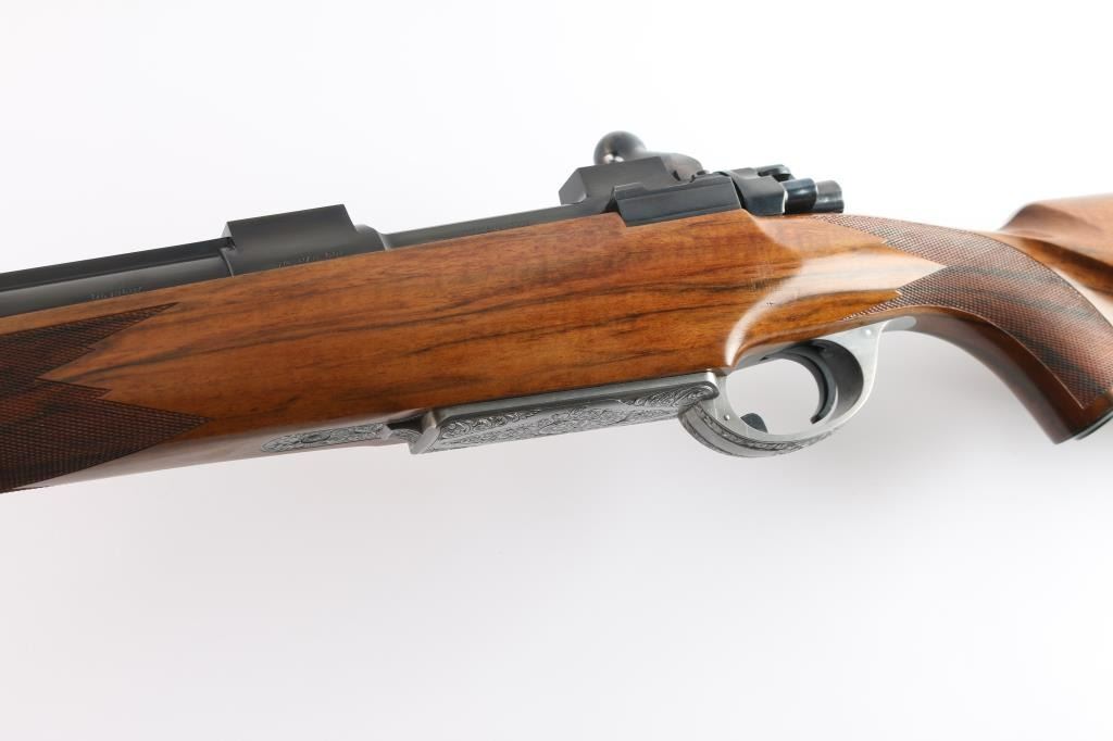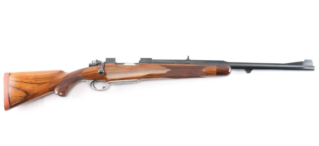 Absolutely massive, custom 22%-oversized double square bridge magnum Mauser bolt action rifle. All custom made, with components made to scale, at proportional sizes. Made by Fred Wells, bottom metal engraved by FEGA Master Engraver Rachel Wells. Barrel is 27.5", overall length is 50" with 14-3/8" LOP, weight is 20.25 pounds. Features blued finish, deluxe walnut stock, two position side swing safety on bolt shroud. Barrel has an integral full length rib, with single leaf express sight and Partridge style front sight blade, sling stud mid-barrel. Top of rib is matted, with thin smooth borders. Stock is fancy figure walnut, semi pistol grip with cheek pieces, contrasting tip, steel grip cap. Bright metal bottom metal has hinged floor plate, drop box design, beautiful even Nimschke style floral scroll engraving. Condition is like new, with pristine bore, 98% finish showing minor handing marks, few blemishes to wood.