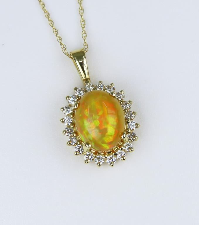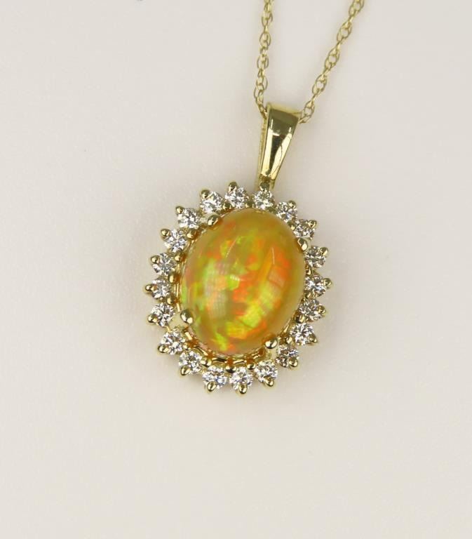 Stunning Fine Welo Ethiopian Opal and Diamond Pendant with Opal weighing approx. 4.00 carats framed with 24 “IDEAL” cut Diamonds weighing approx. 0.50 carats with G-H colors and VS clarity set in 14 karat yellow gold setting. Retail $4,000-$6,000.