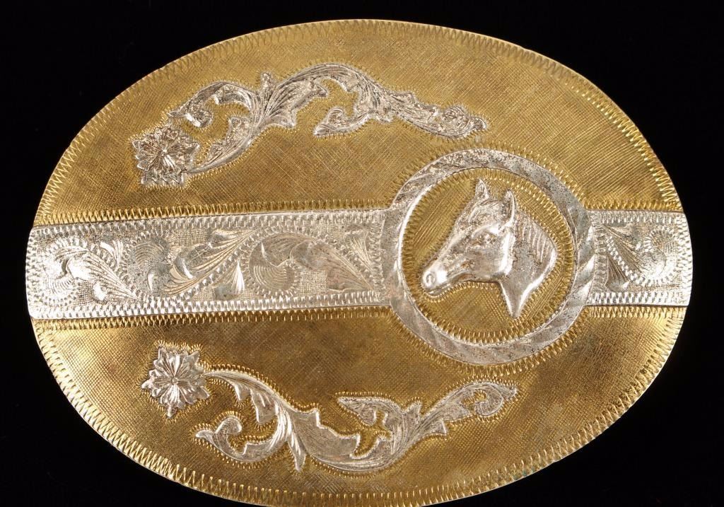 Silver overlay with horse's head and floral designs. "Vogt" stamped inside spur on back.
