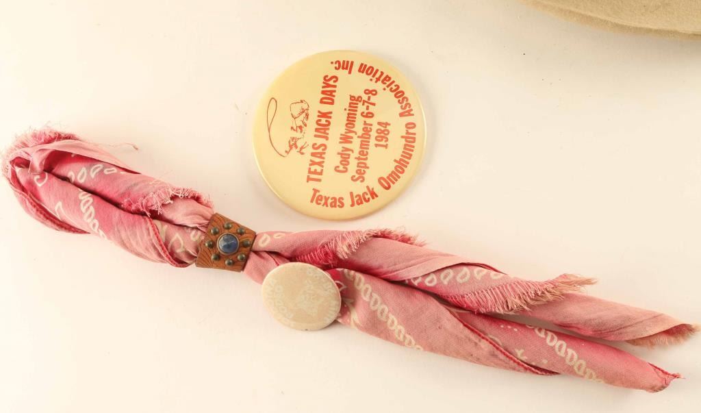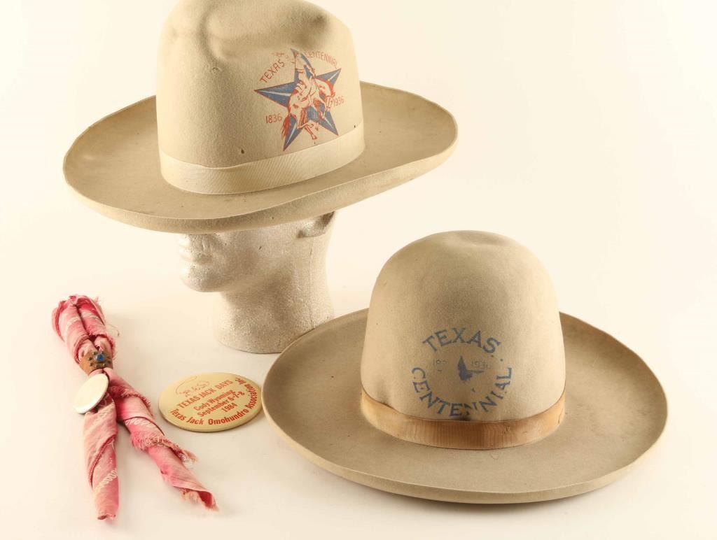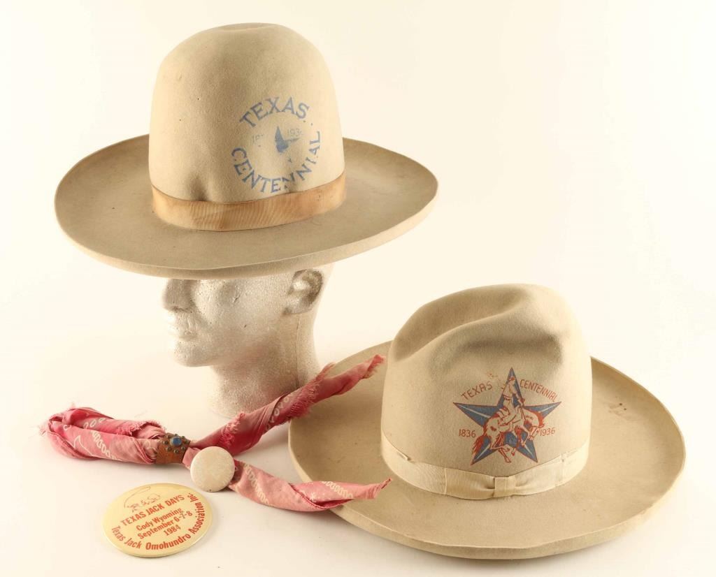 Includes (2) Texas Centennial hats, one shows age with fading to the lone star, the other had is in excellent condition and only shows minor signs of aging. Lot also includes button reading "Texas Jack Days Cody Wyoming September 6-7-8 1984". and button on handkerchief with a pin that reads "Soldotna Rodeo July 28-29", shows age.
