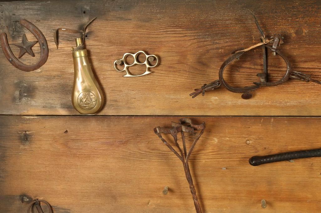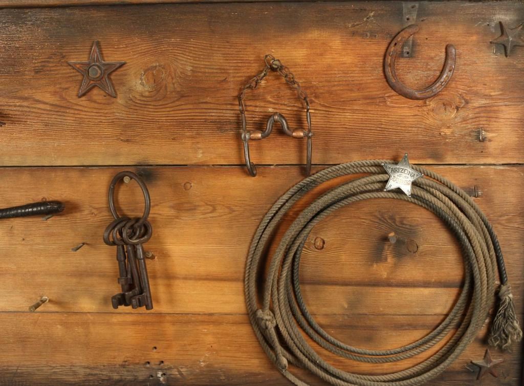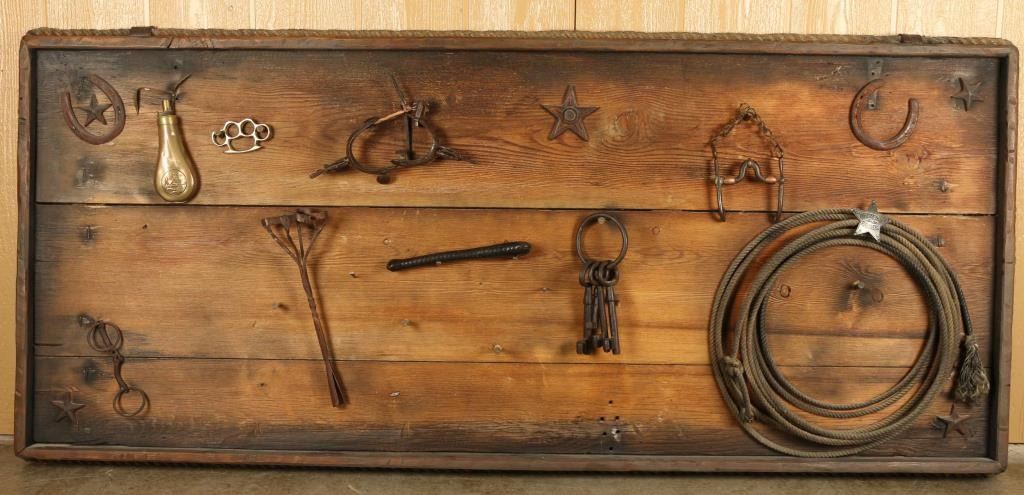 With Antique Rope, Old Keys, Spurs, Powder Flask, Horse Shoes, and Branding Irons.