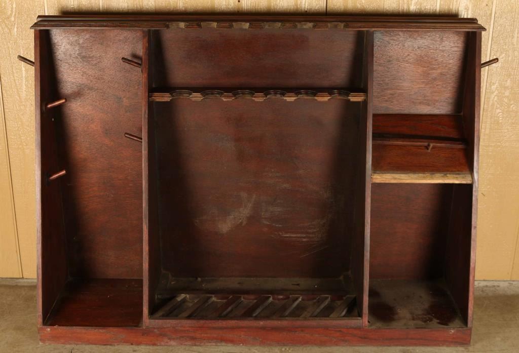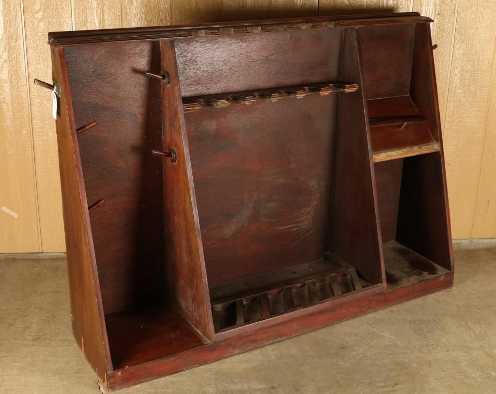 Holds 6 rifles has hooks for handguns or gun leather, dark stained veneer good condition some loses on sides. Measures 60" x 42 x 16".