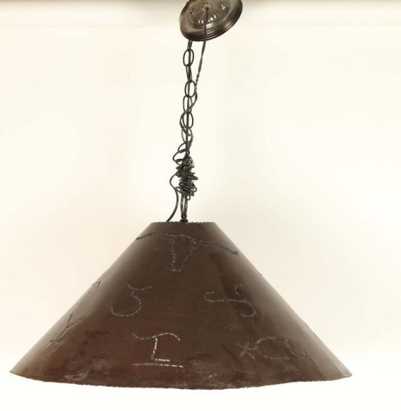 Rustic metal shade with steer, cowboy hats, saddles, brands and horseshoes pattern. Made for light filtering shade. Must be hard wired in, measures 30" dia.