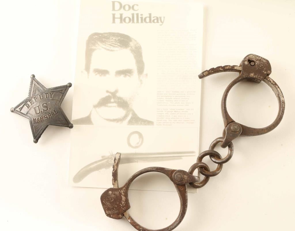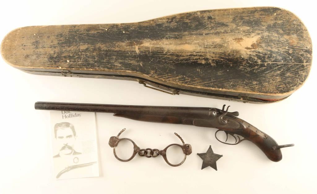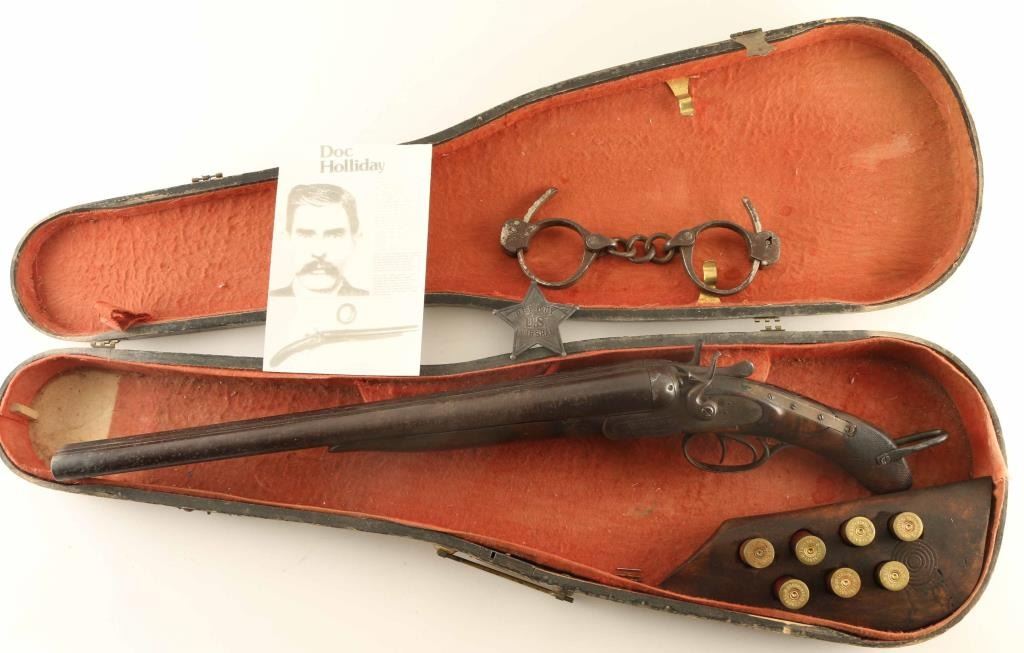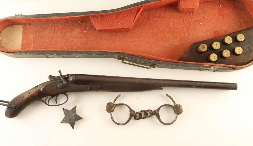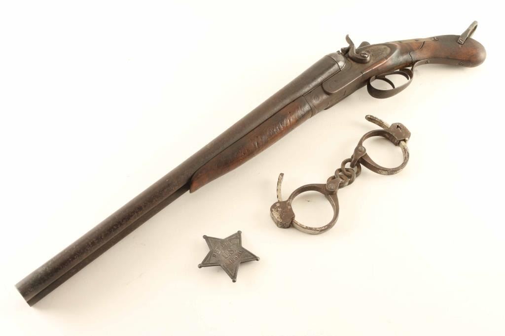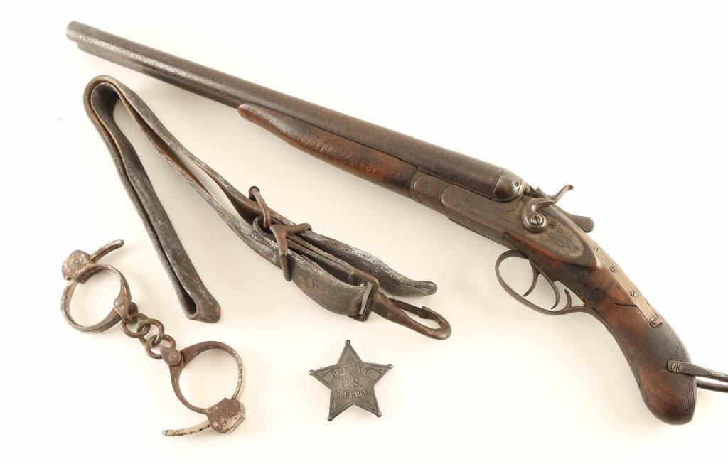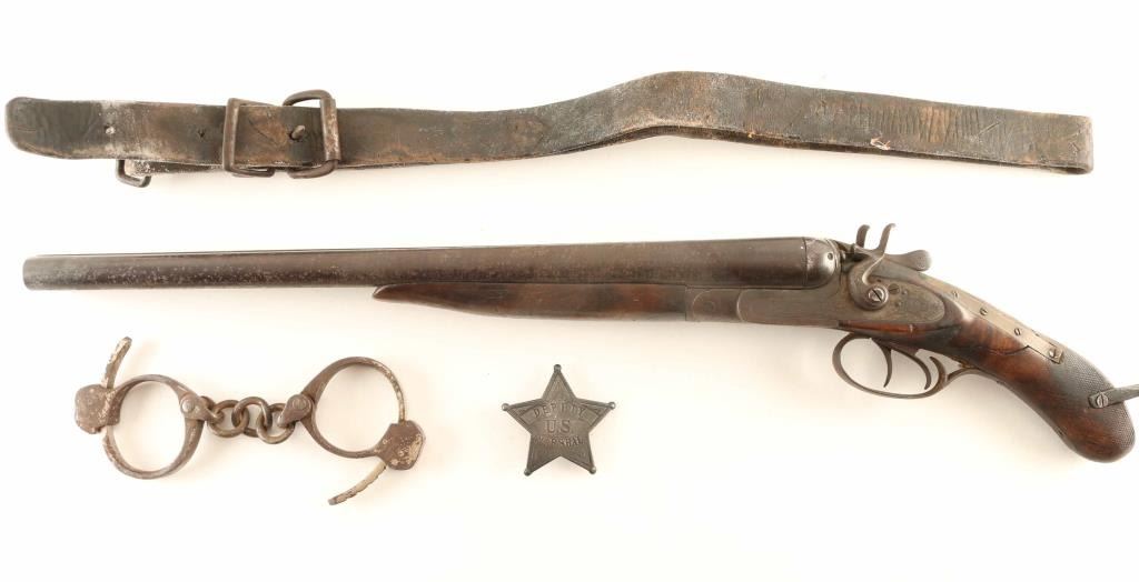 2) Fair condition heavy leather sling with snap hook, appears to be re-purposed from horse tack, to allow shoulder sling carry of shotgun in the manner attributed to famous Old West personalities such as "Doc" Holliday and Porter Rockwell.