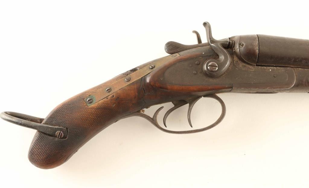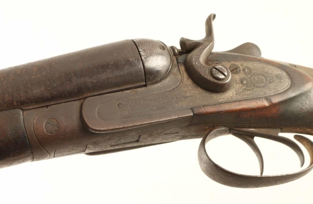 1) NVSN - W. Richards 12 GA double barrel shotgun, made in Belgium. Features 18" side by side barrels, side locks with external hammers, sawed off stock with wood pistol grip and iron lanyard ring. Antique firearm for display only. Bores are fair condition. Metal is uniformly covered with dark brown patina and rust, with speckles of lighter brown rust on barrel. Wood grip is cracked; repaired with brass strips and screws. Large lanyard ring. Locks generally function but are sticky and firing pins do not retract.