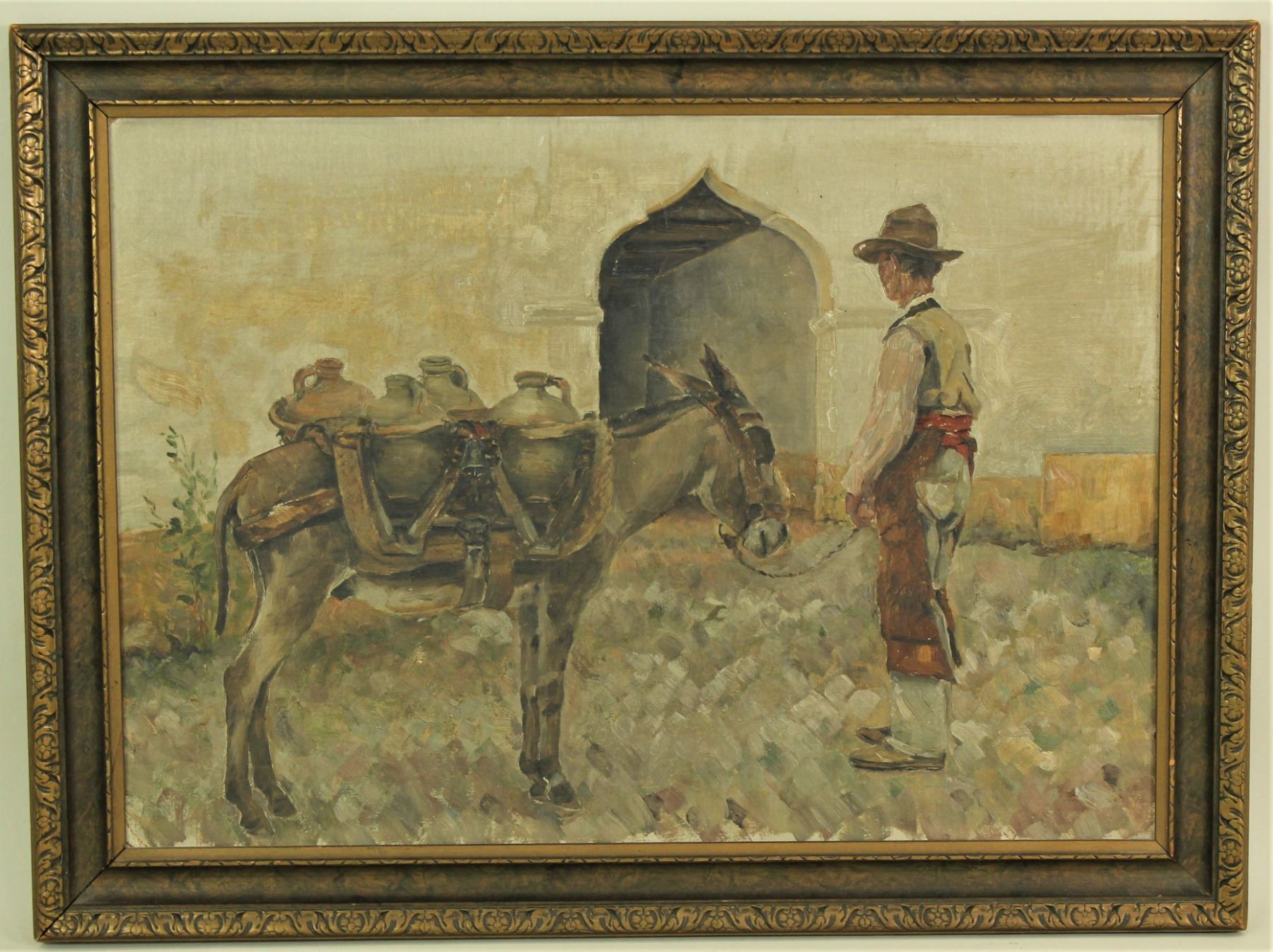 Interesting unsigned oil on board with professional frame, image measures 14"x 20".