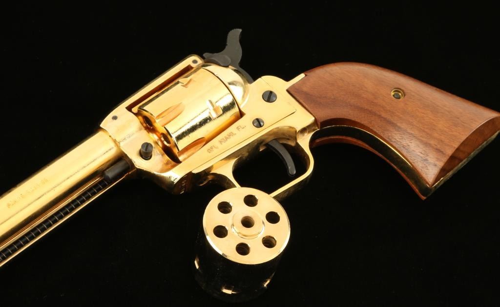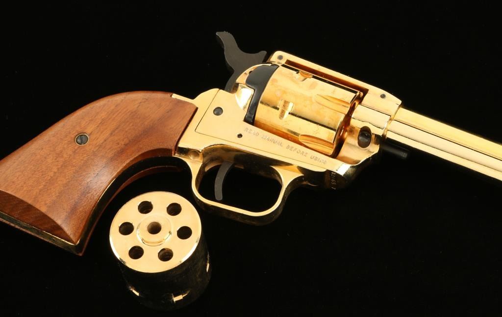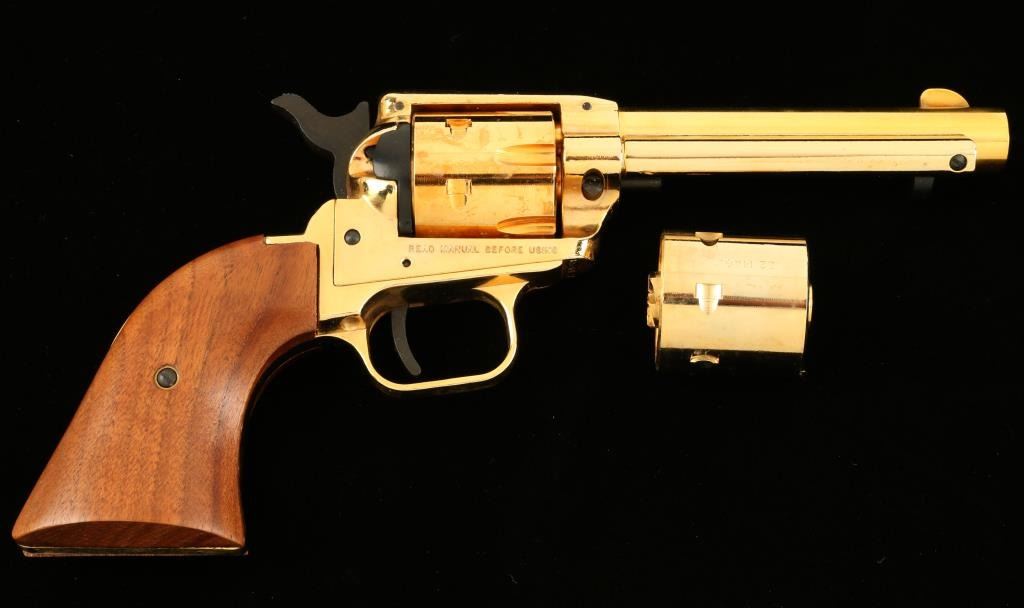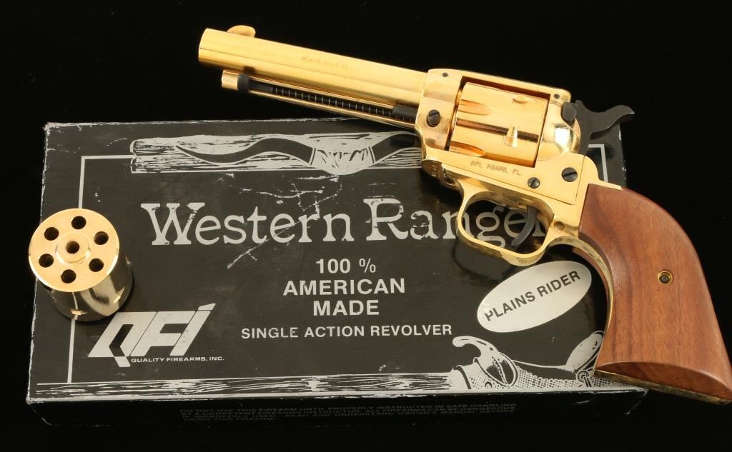 Western Ranger Plains Rider SA Revolver, .22 caliber, 4 ¾” barrel, wood grips, gold finish, S/N rr06507. This revolver remains in overall very good plus condition with most of its original finish remaining. The wood grips are in excellentcondition. The action is very good and the bore is good. Also included is its original box with .22 mag cylinder. (Modern/PPT). Est.: $100-$200