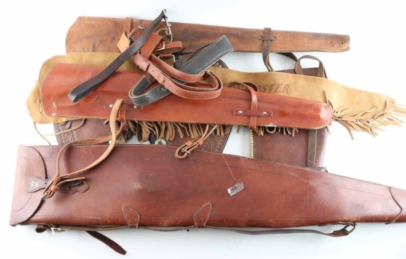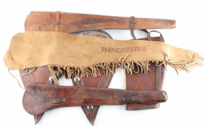 includes (9) items, including (3) leather scabbards (by Hog Island, VL&A, unmarked), leather rifle case, fringed suede rifle cover marked "Winchester", pair of tooled leather tapaderos (fair to good condition, no stirrups, nickel star conchos), other items.
