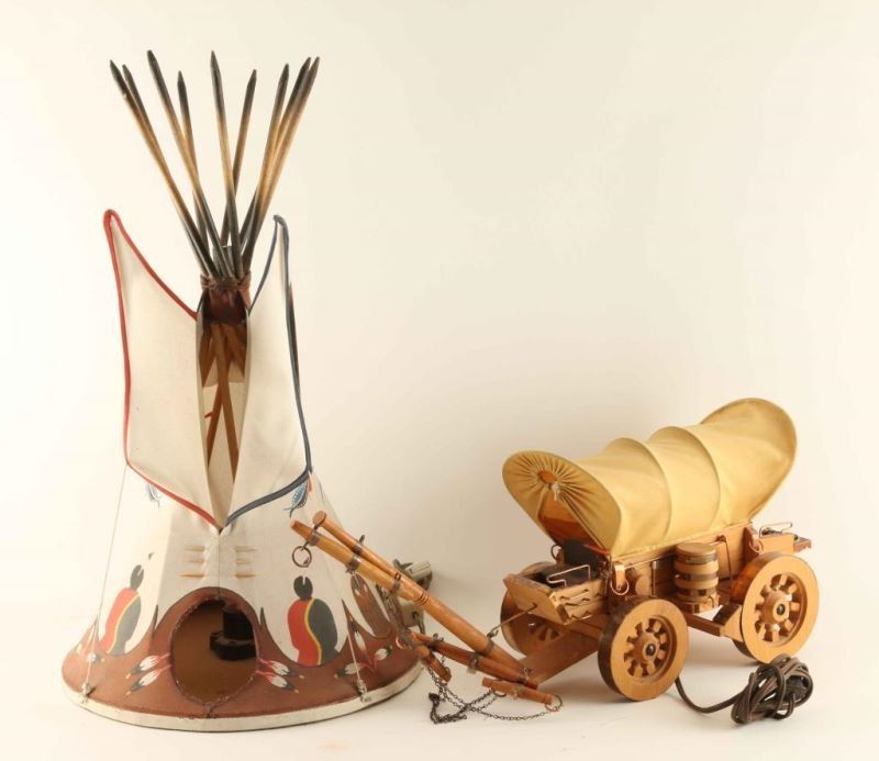 Painted teepee light with figures, feathers and birds. Light sits in center of teepee, in working condition measures 22 1/2"hx12"dia. Covered wagon light- wooden wagon with fabric covered top with metal and wood details of barrel, pickaxe and shovel, locked trunk and more. Light inside is in working condition. Measures 12"hx16"lx6"d.