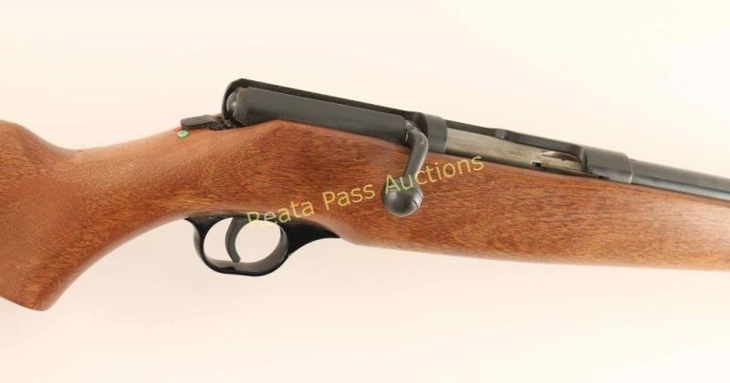 Vintage bolt-action shotgun chambered for 2 1/2" or 3" .410 gauge shells, circa 1948-1985. Features a blued finish, 24" barrel, brass bead front sight, internal box magazine, manual safety, bent bolt handle and one-piece smooth wood pistol grip shoulder stock with serrated black plastic buttplate. Includes a Gun Guard hard rifle case, a 25 round box of Federal Hi-Brass Game-Shok 2 1/2" 6 shot shotshells and an owner's guide. Shotgun exhibits approximately 94% of it's original finish showing few handling marks and some scattered small areas of surface rust found on the barrel & on the back of the receiver. Action is mechanically sound, bore is excellent and wood stock is near fine with few minor blemishes. Condition is very good. ***Modern Firearm***