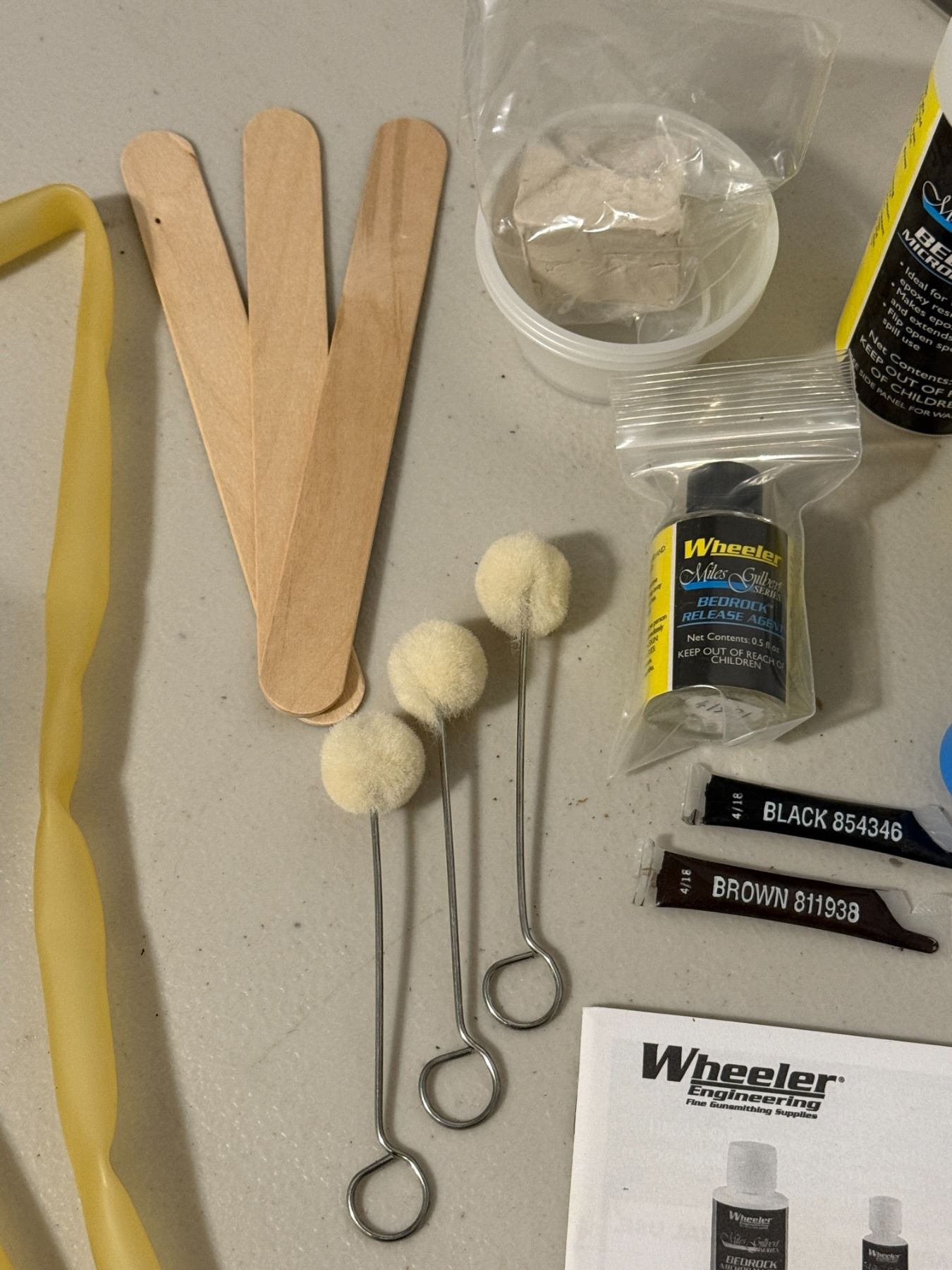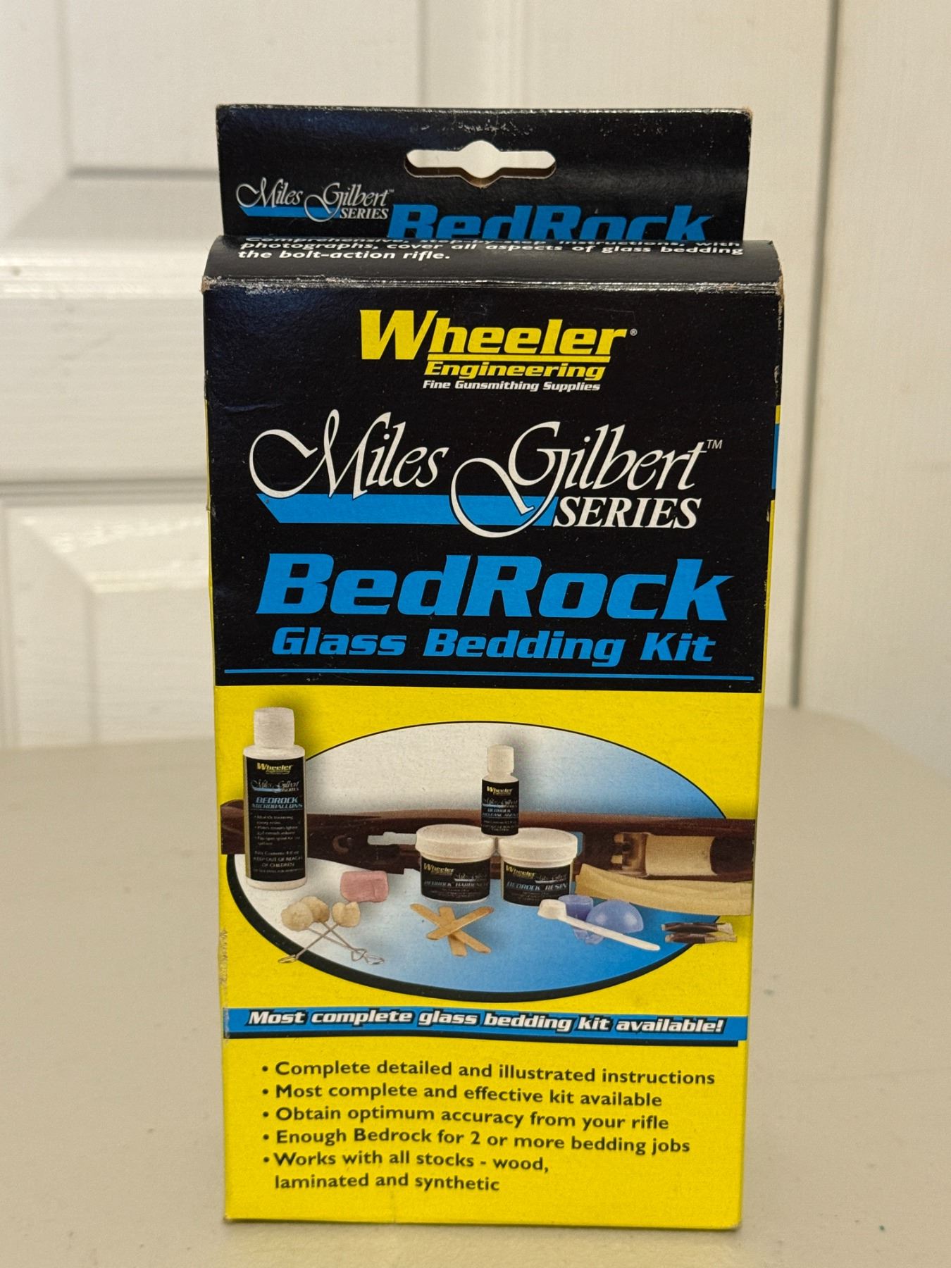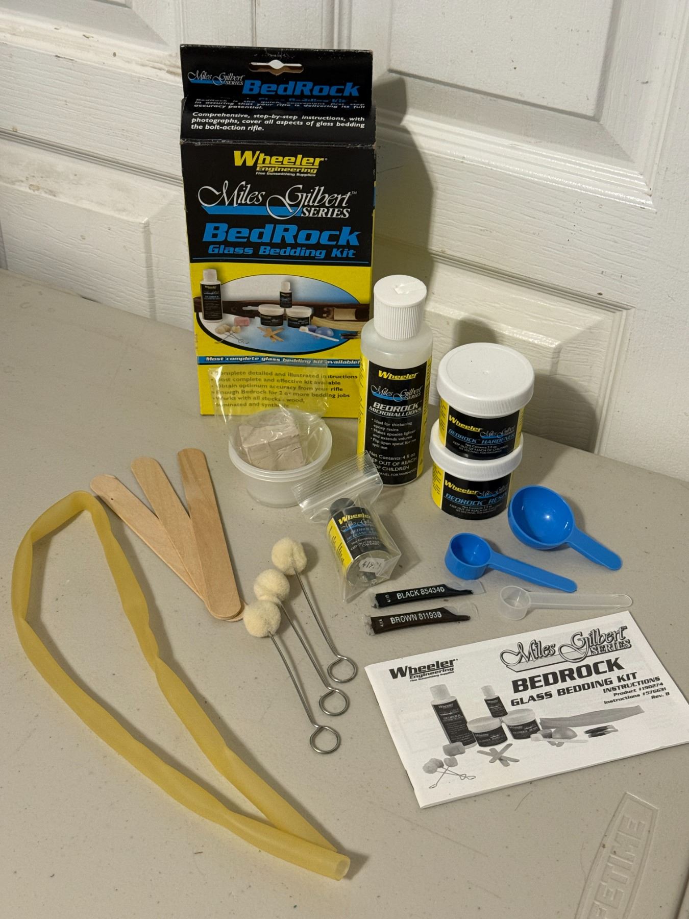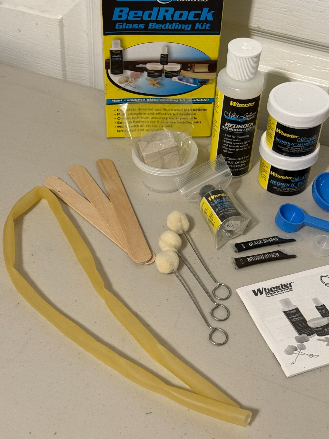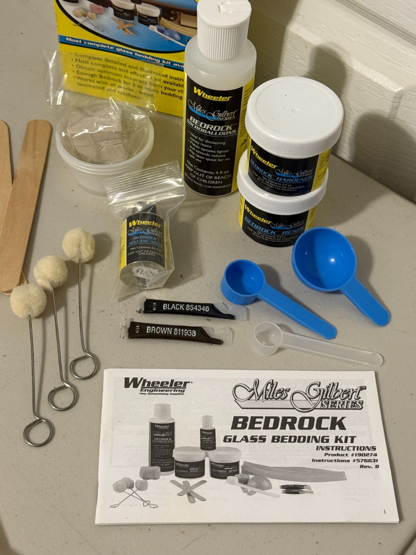 Complete rifle glass bedding kit with resin, hardener, release agent, micro-balloons, tools, and instructions. For improving accuracy and stock fit on bolt-action rifles. Contents appear complete as shown.