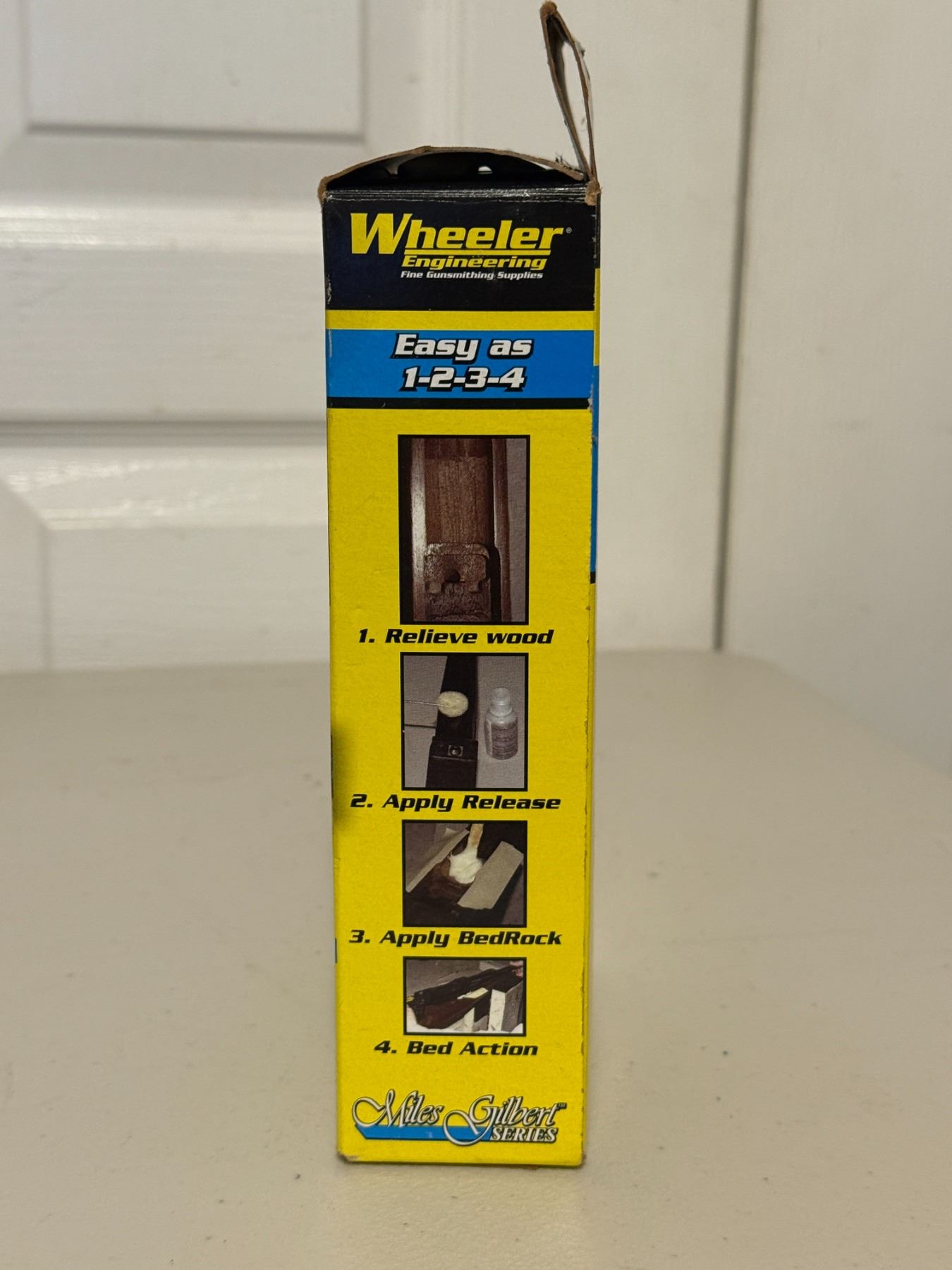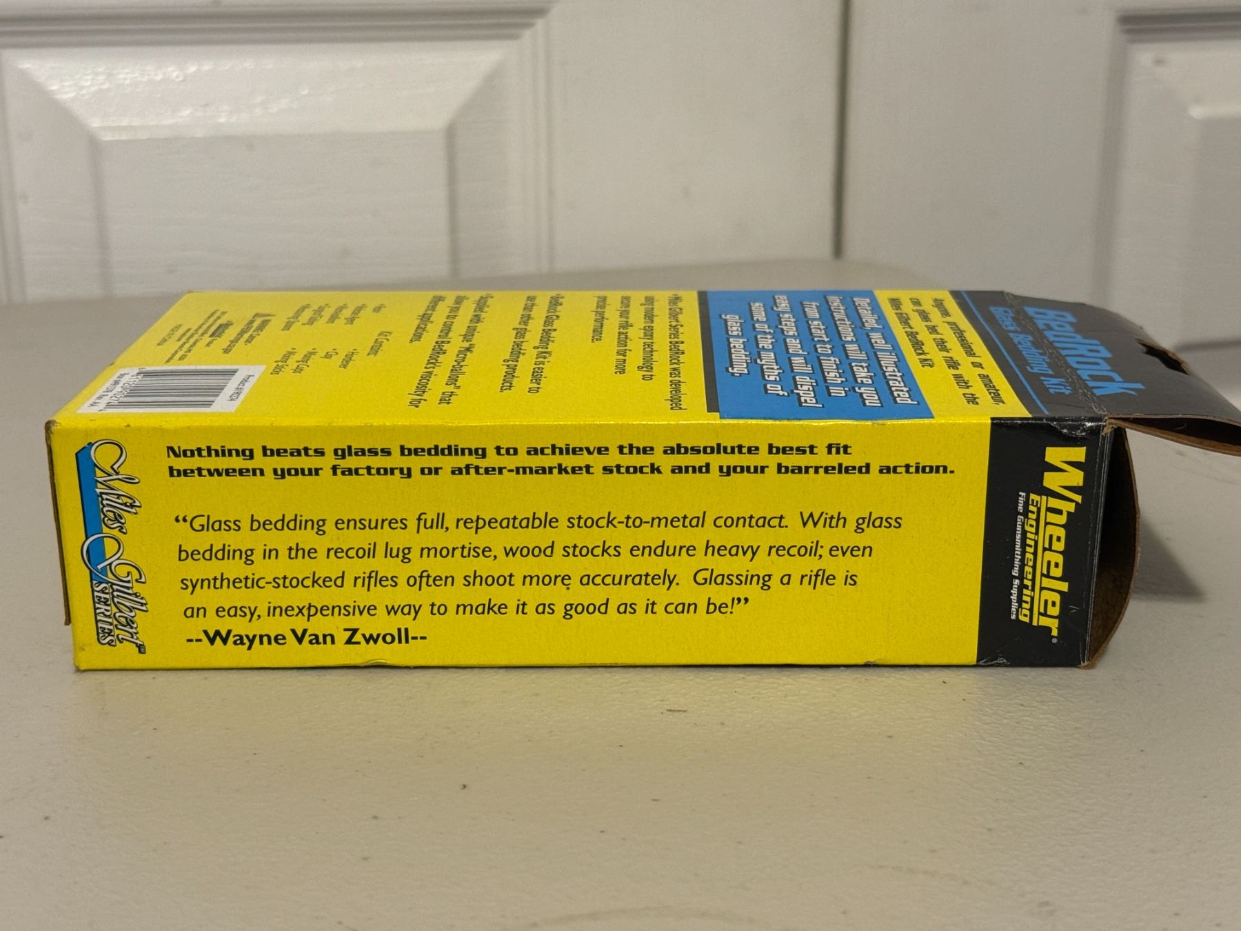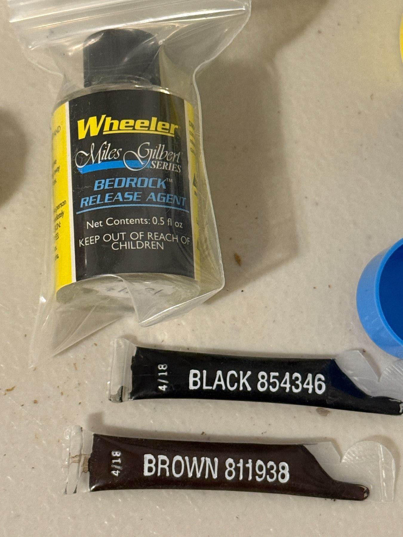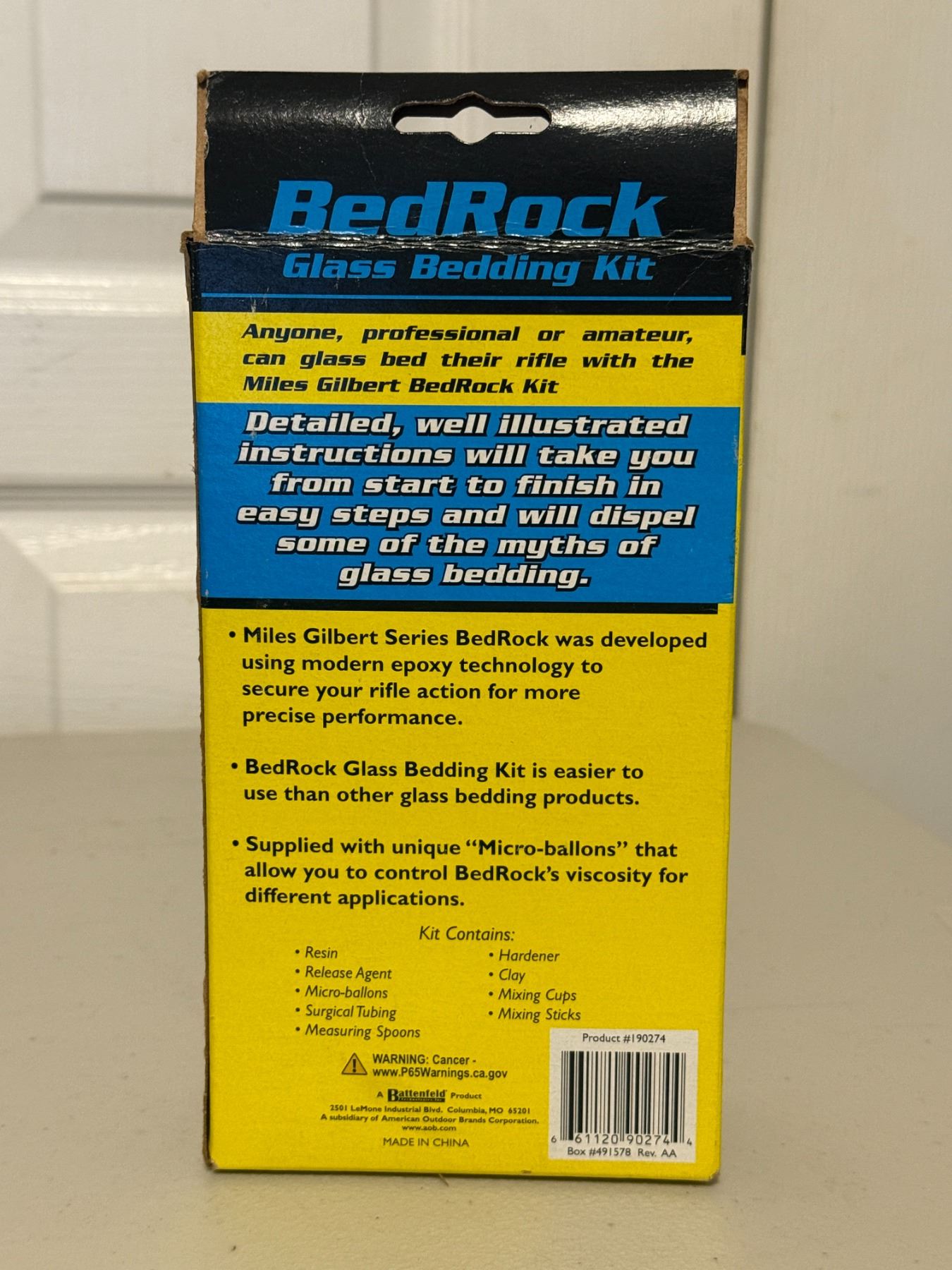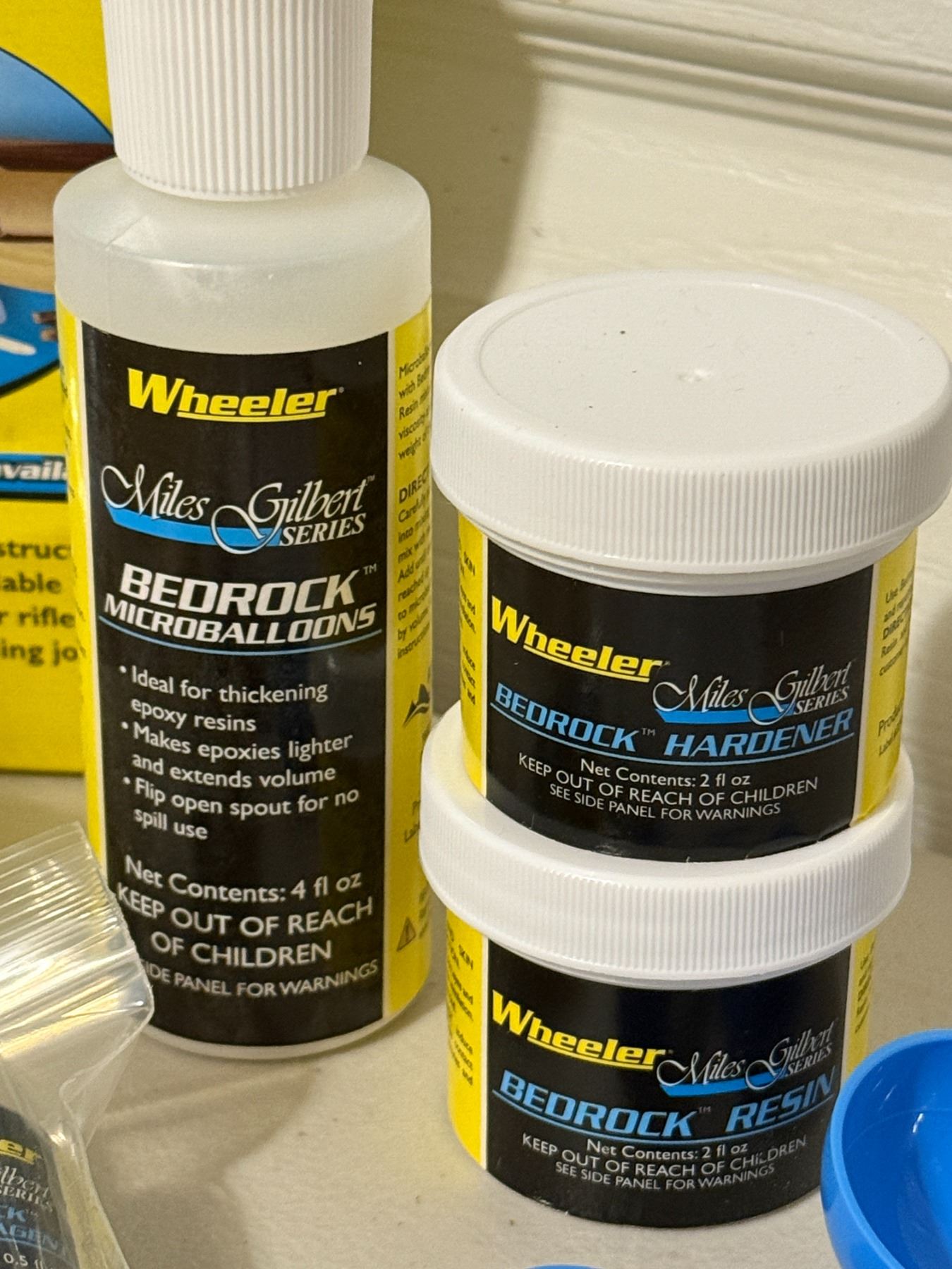 Complete rifle glass bedding kit with resin, hardener, release agent, micro-balloons, tools, and instructions. For improving accuracy and stock fit on bolt-action rifles. Contents appear complete as shown.