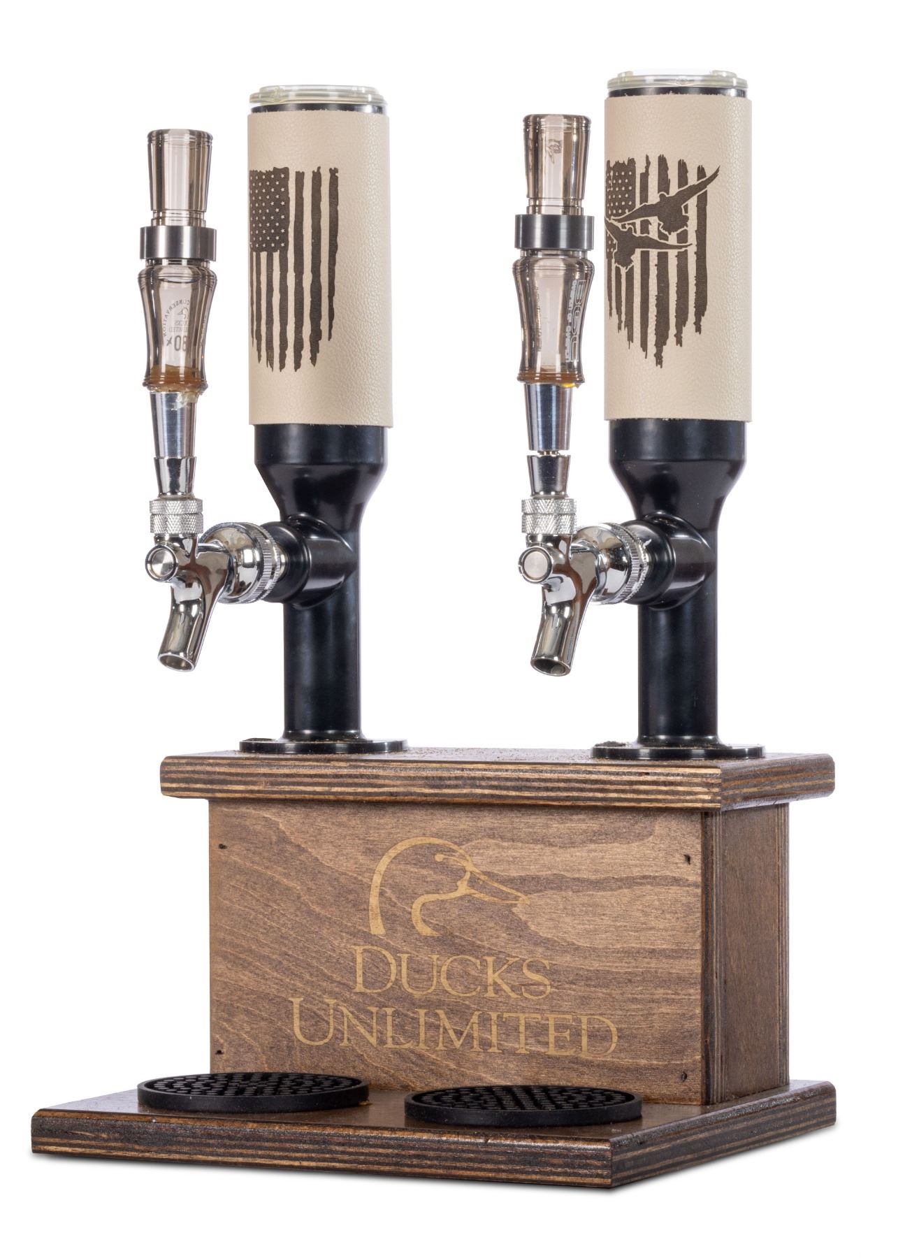 The Whiskey Tower - Double stands as an impressive bar top centerpiece, a blend of functionality and elegance. This double whiskey tower is designed to elevate your drinking experience, offering a unique touch to your space. The set includes two engraved ivory leather sleeves, each adorned with custom duck call tap handles, creating a distinct and personalized aesthetic. The wood base features the stacked Ducks Unlimited logo, symbolizing your dedication to conservation. Crafted in the USA, this Whiskey Tower - Double is not only a bar accessory but also a statement piece that captures the essence of Ducks Unlimited's mission while adding sophistication and style to your drinking space.