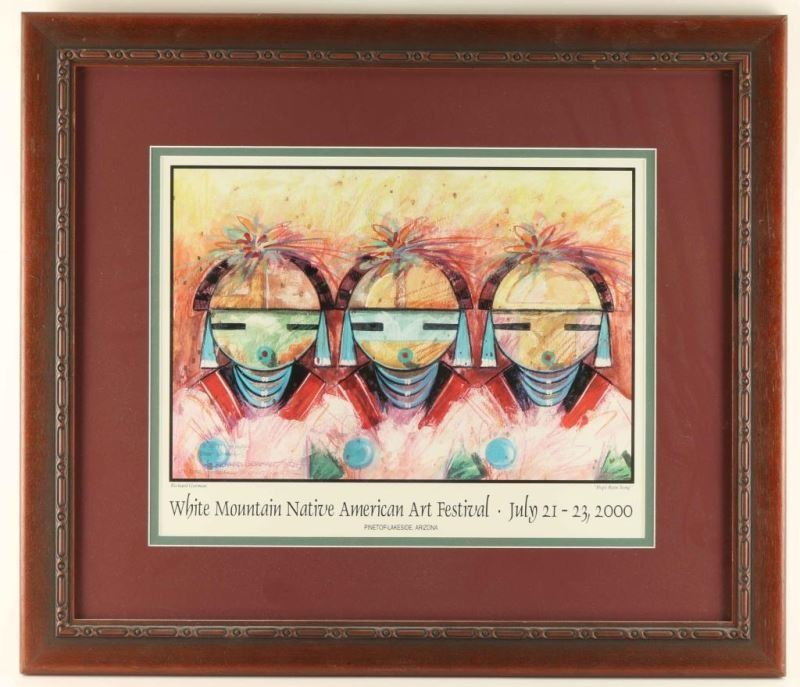 Print July 2000, by Richard Gorman, hand signed in pencil lower left, depicts three Kachinas, with a double mat in wood frame, image size is 171/2X14"