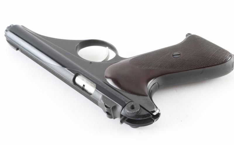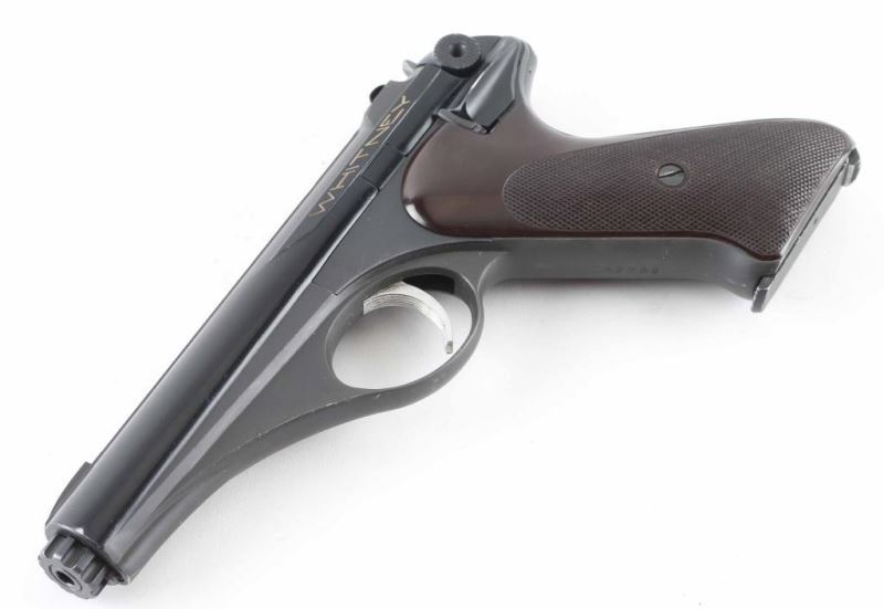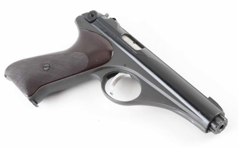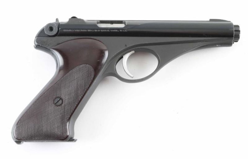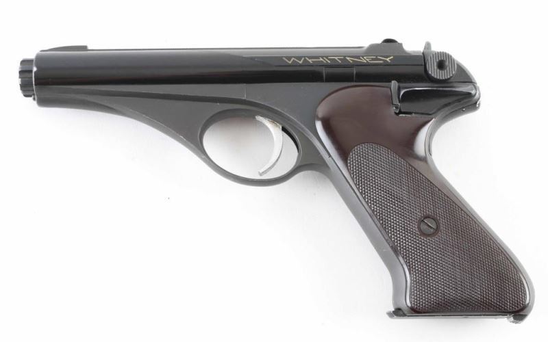 Vintage single action semi-automatic pistol chambered in .22 Long Rifle, manufactured circa 1956-1957. The Wolverine pistol has a short lived but tangled history including a lawsuit and multiple manufacturers. This pistol was produced by the first company, Whitney Firearms Inc. which was started by the Wolverine's designer Bob Hillberg. The total production number for this company is estimated to be 10,793. Features a matte grey anodized aluminum frame with glossy black enamel accents, 4.6" threaded barrel, fixed patridge front sight, drift adjustable rear sight with square notch, serrated silver color accent trigger, semi-shrouded hammer, manual safety on the left side of the frame, cylinder shaped cocking knobs, magazine disconnect safety, heel magazine release, 10 round magazine, and two-piece checkered brown plastic grips. Bore is very good condition. Retains 95% finish with handling marks, edge losses. Grips are fine. Includes (1) magazine. Condition is NRA Very Good++ *** C&R Firearm ***