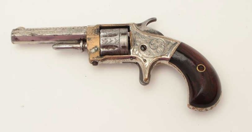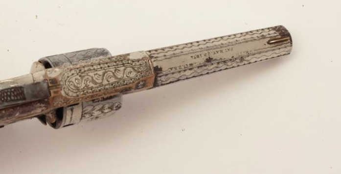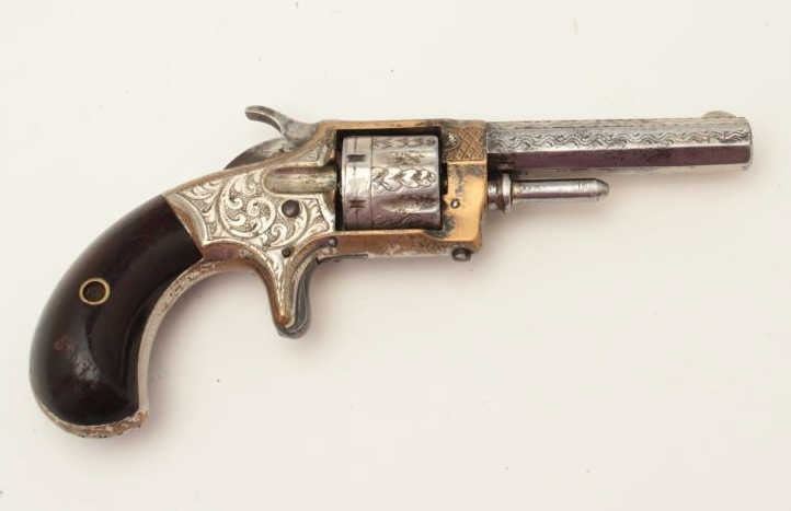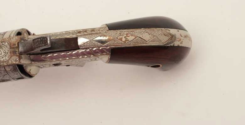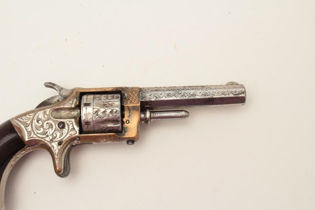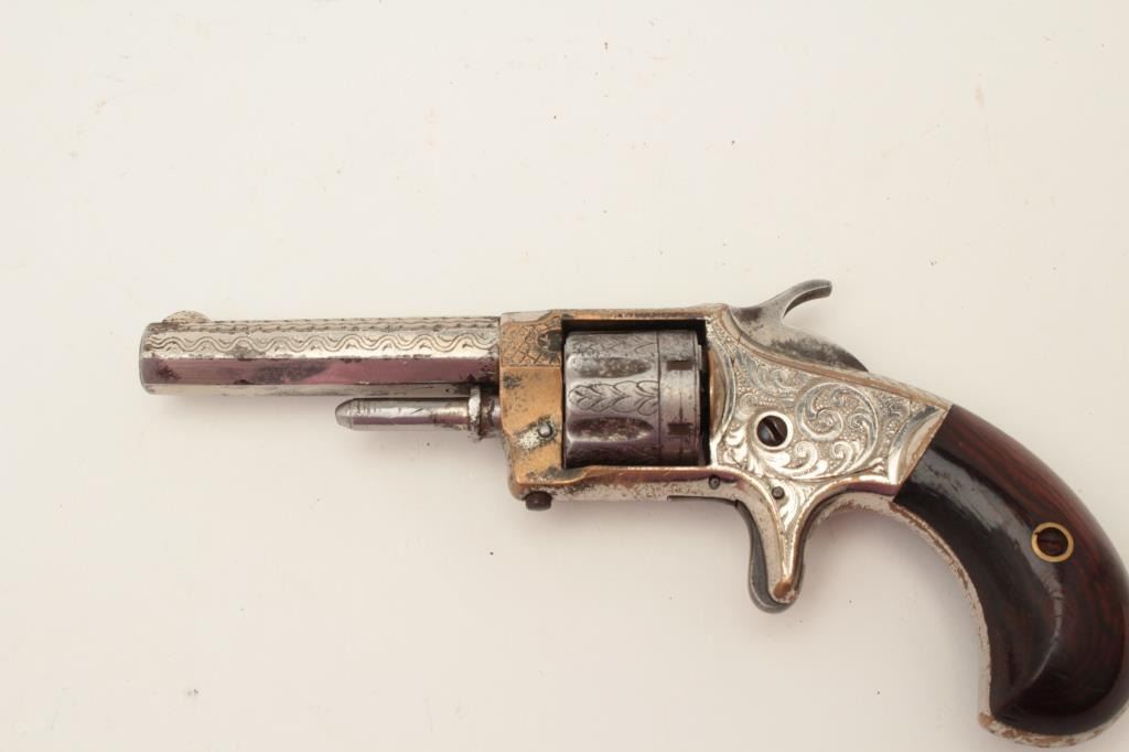 Whitneyville .22 caliber spur trigger revolver, 2.75” octagon barrel, engraved, nickel finish, rosewood grips, S/N 13048D, in overall very good condition. (Antique). From the Whitney family collection. Est.: $400-$800.