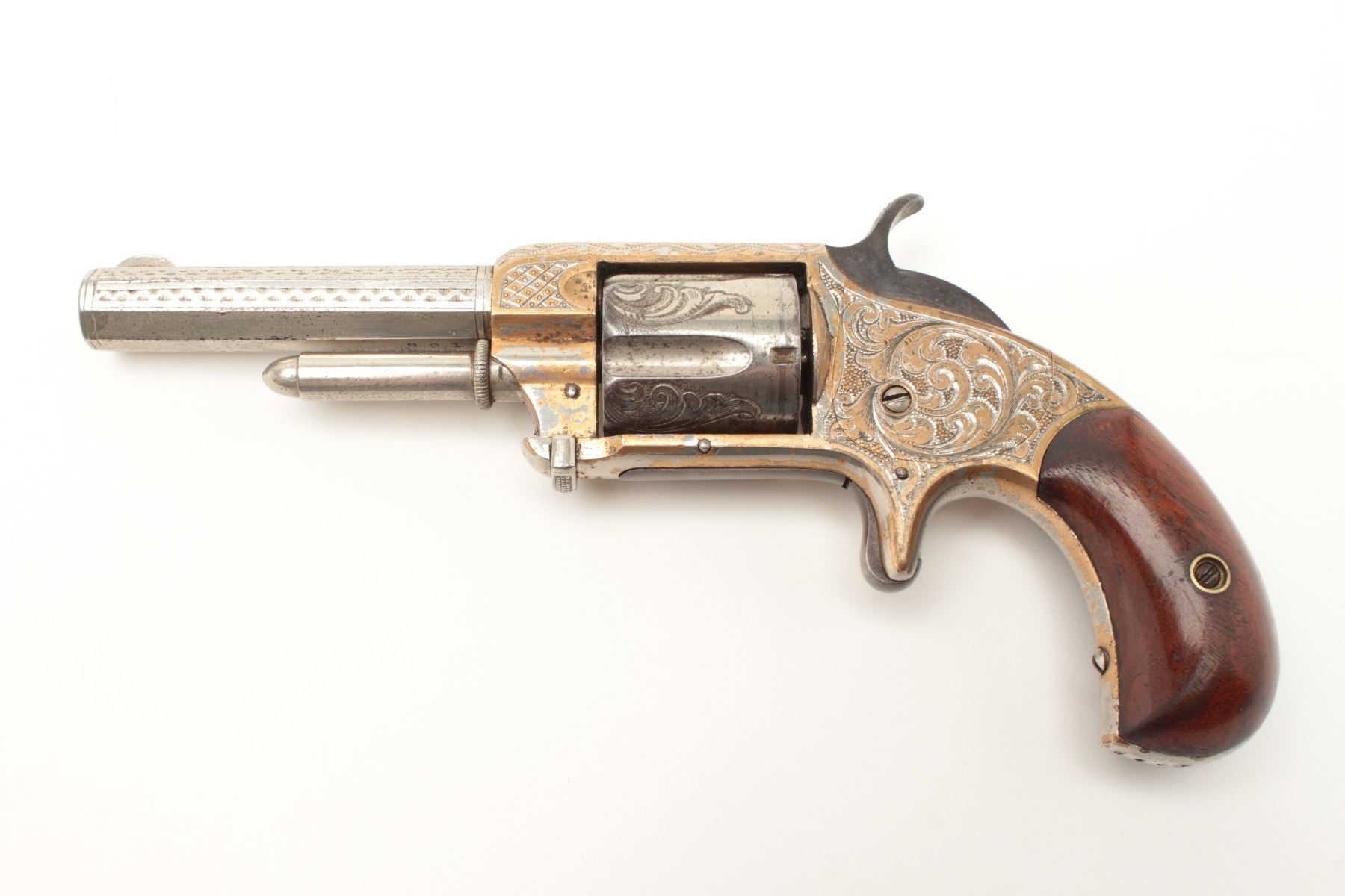 Whitneyville .32RF caliber spur trigger revolver, 3.25” octagon barrel, fully engraved, nickel finish, rosewood grips, 5-shot cylinder, deluxe New York engraving in Nimschke style. (Antique). From theWhitney family collection. Est.: $400-$800.