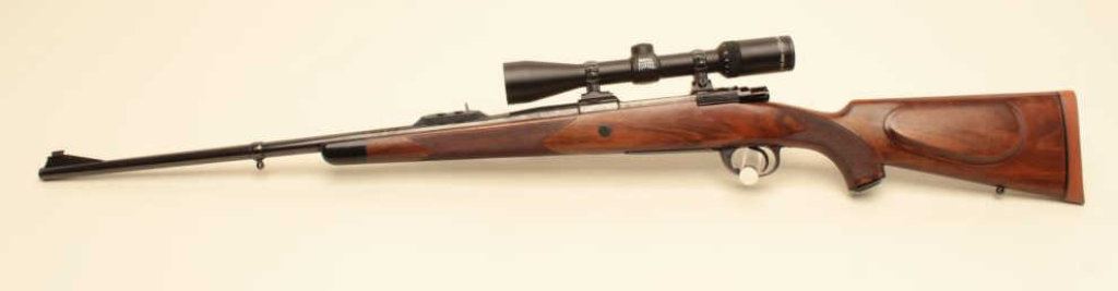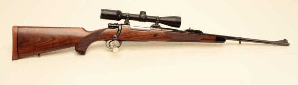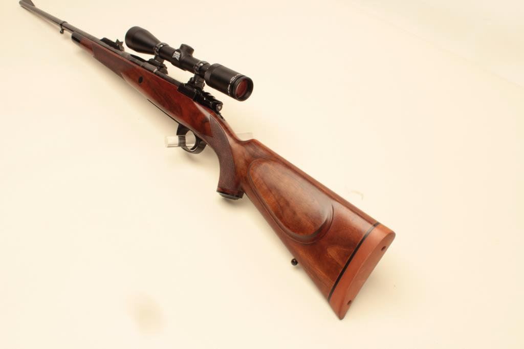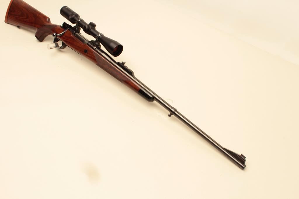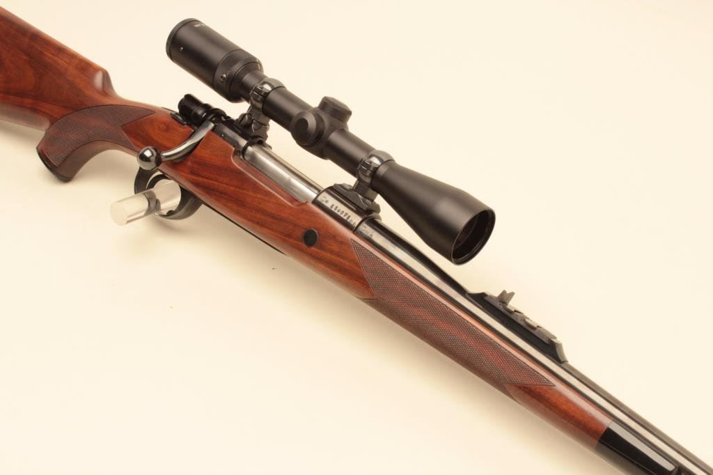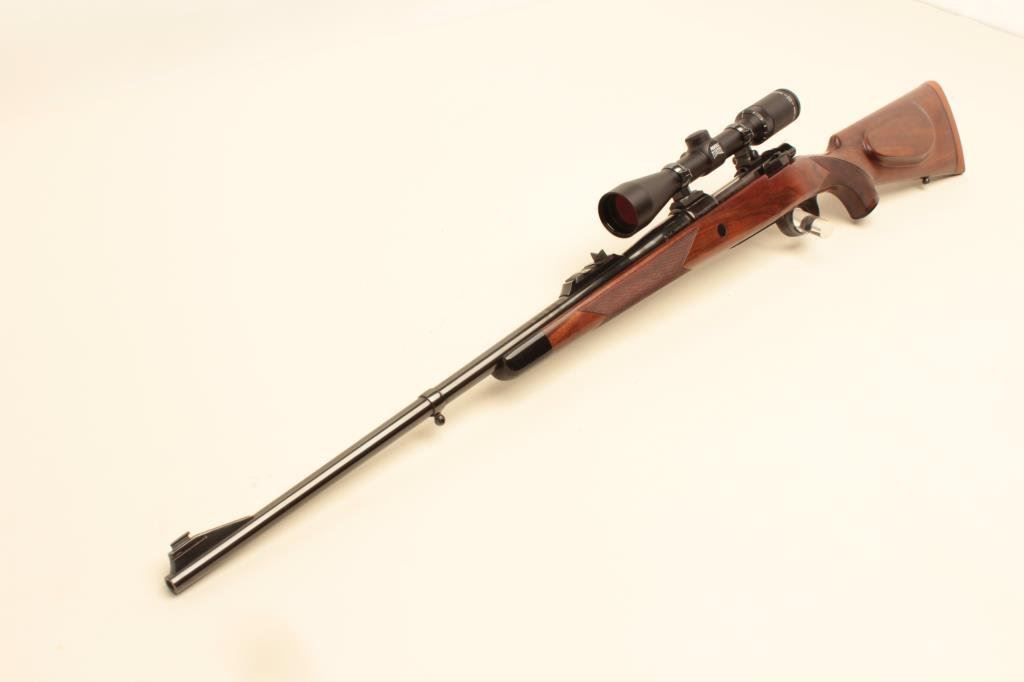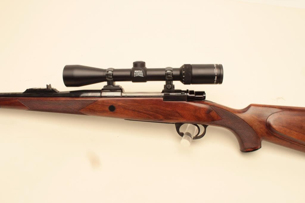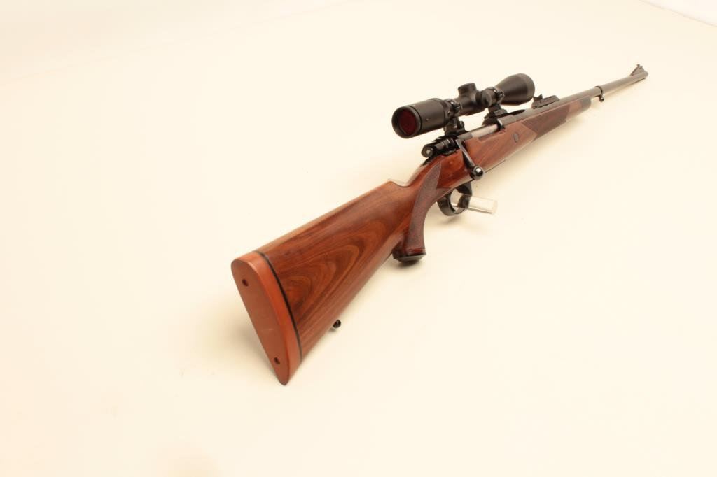 Serial #230672. The rifle is in very good to nearly fine overall condition with a 24” barrel. The barrel retains nearly all of its high polish blued finish with a ramp front and two-leaf express rear sights. The barrel address reads, “WHITWORTH RIFLE COMPANY, MANCHESTER ENGLAND.” The receiver has nearly all of its high polish blue with a variety of British proof marks noted. The finely checkered wood stock is in very good condition with ebony fore end, barrel mounted sling swivel and a recoil pin added. The butt stock features a beaded cheek piece and red rubber recoil pad providing a 13 ¾” LOP. The rifle is topped with a two-piece scope mount and a Pentax Pioneer 3 x 9 variable power scope with clear, crisp optics. The bore is very good, the action crisp and markings are sharp on this early English Whitworth that has seen little use. Est.: $400-$800. (Modern).