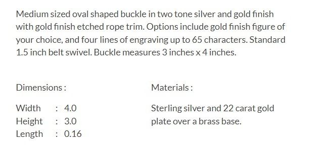 Medium sized, oval shaped buckle in two-tone silver and gold finish with gold finish etched rope trim. Room for four lines of engraving up to 65 characters (not included). Standard 1.5 inch belt swivel. Buckle measures 3 inches x 4 inches.