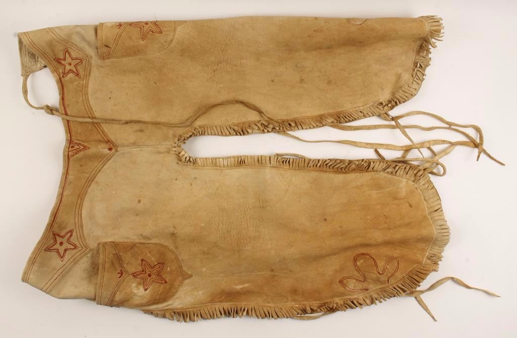 Buckskin leather with 2 front pockets. Accented with red stitching of stars and saguaro cacti. Fringe on all sides of legs. Leather cords to tie on over pants.