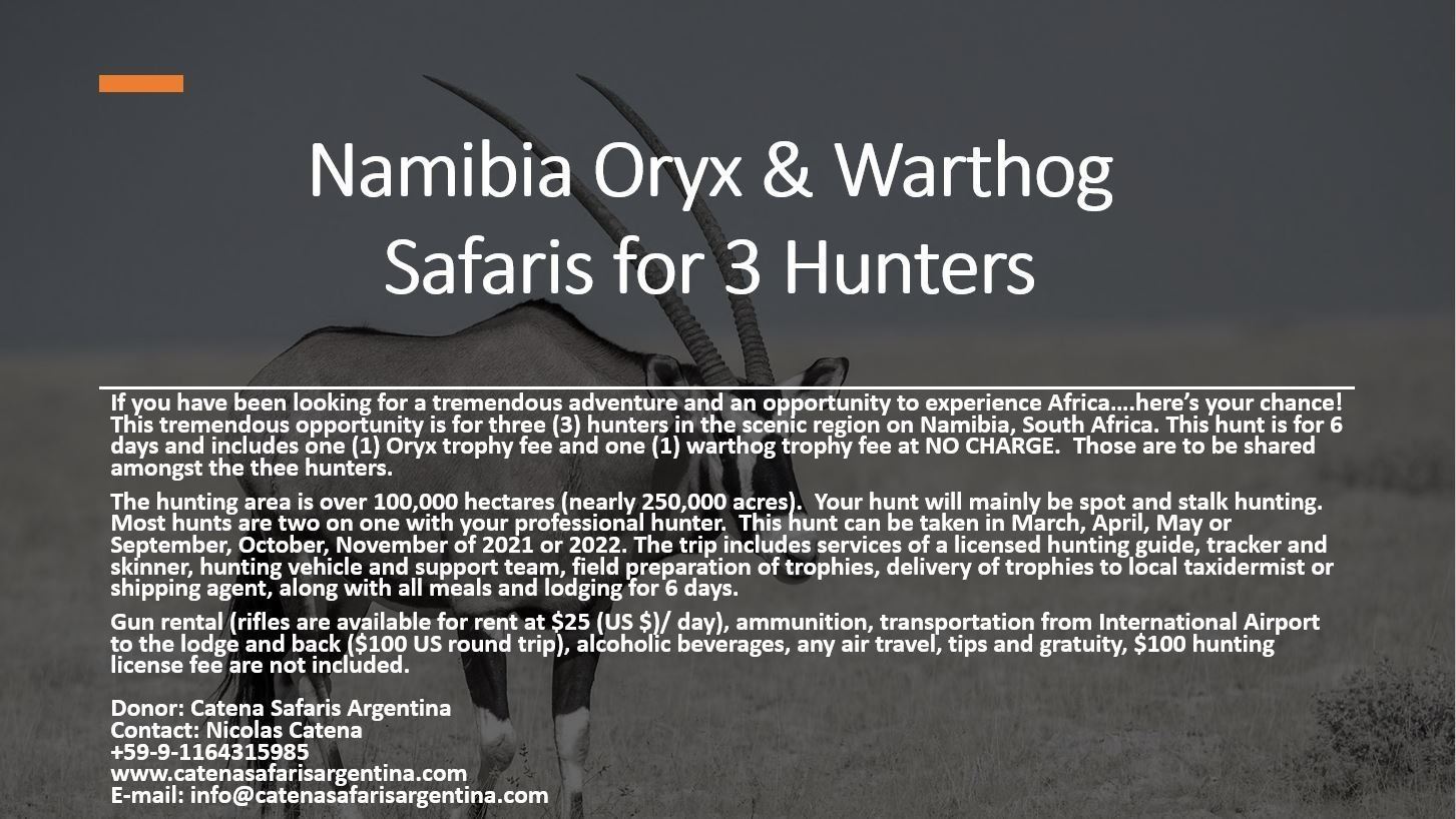 Wildest International Safaris donates a 6-day hunt for Namibia Oryx and Warthog for 3 hunters in Namibia, South Africa.