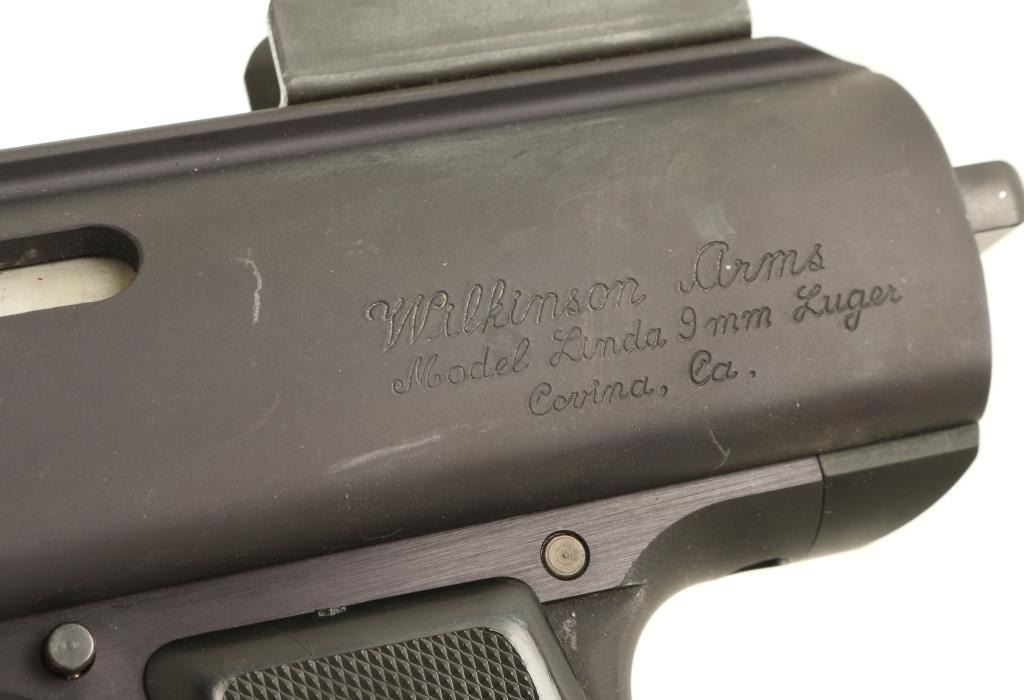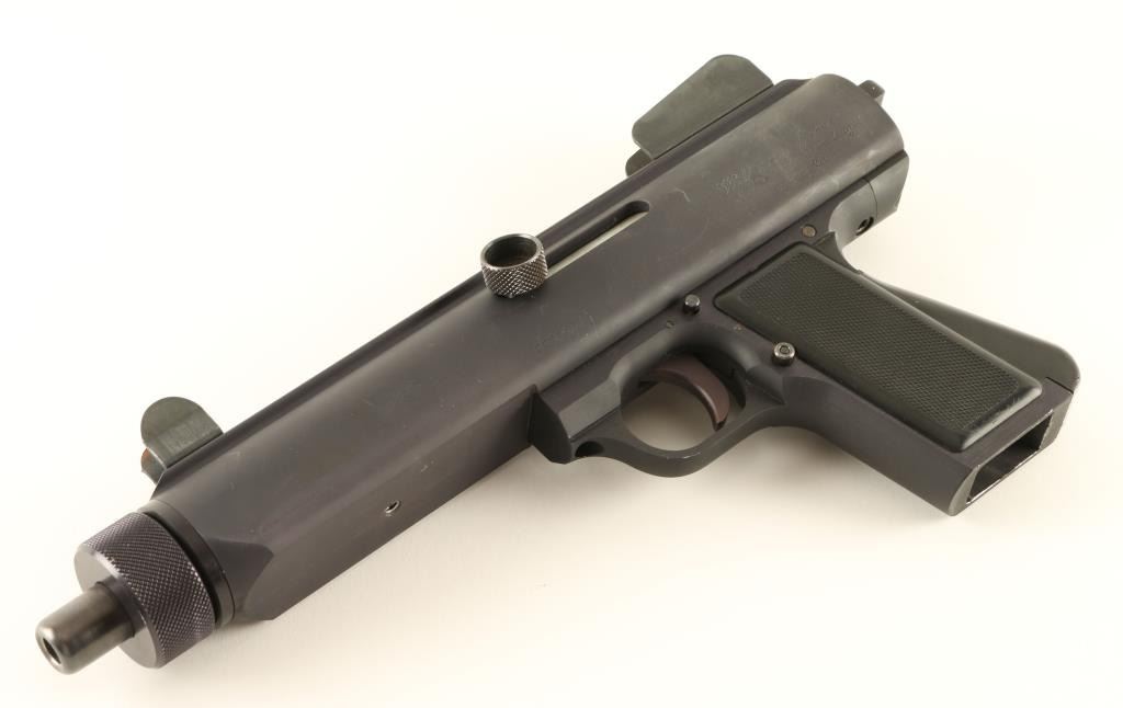 Large uniquely designed semi automatic pistol chambered in 9mm Parabellum. Features a matte black finish, 8 3/8" barrel, winged front sight, adjustable rear aperture sight, checkered round charging handle, push button safety, dust cover, lanyard loop, checkered black plastic grips and no forend or magazine. Pistol shows minor scuffs on the receiver and surface rust on the front sight shroud. Action is smooth, bore is excellent and plastic grips are fine. Condition is near excellent. ***Modern Firearm***