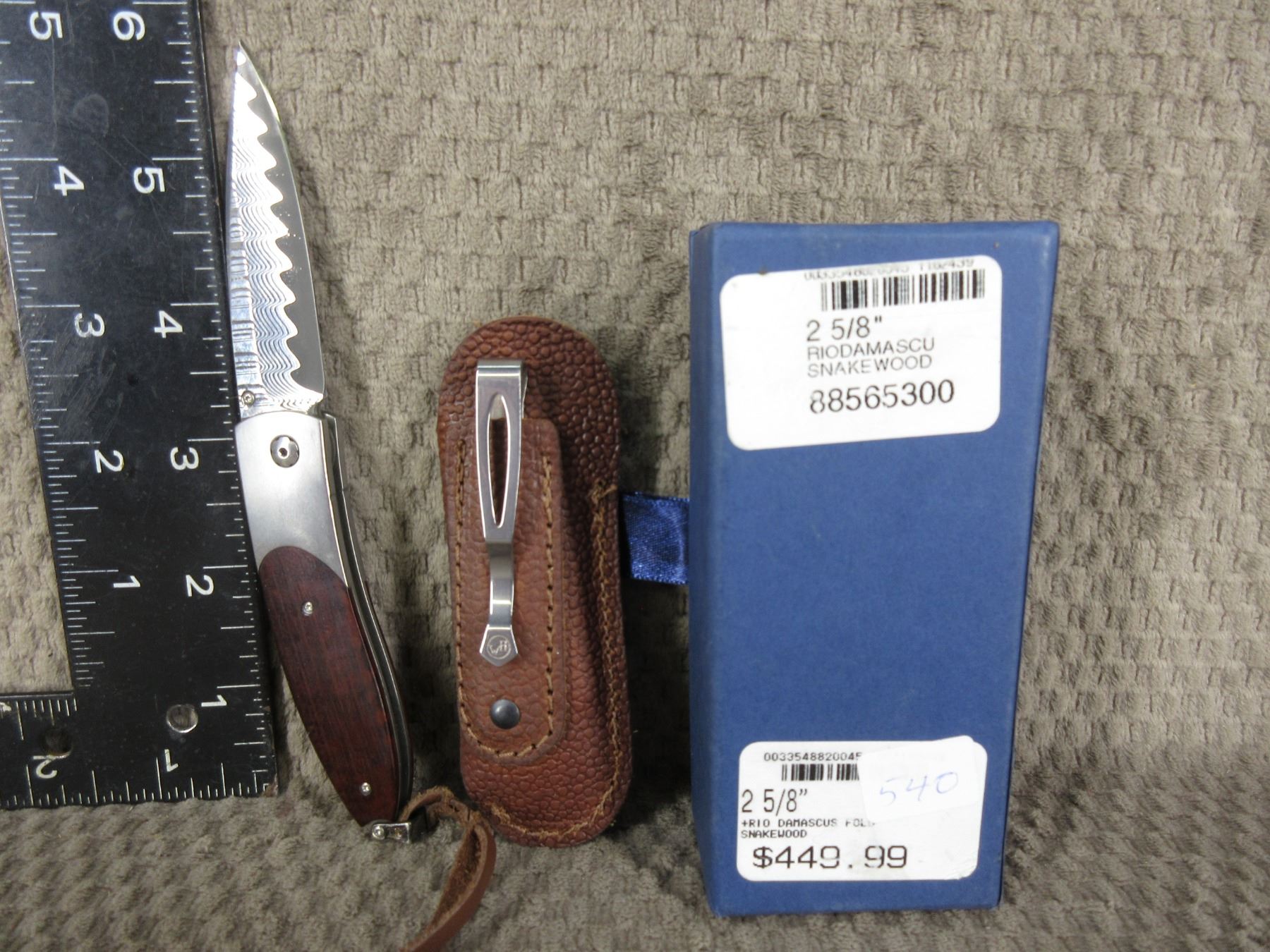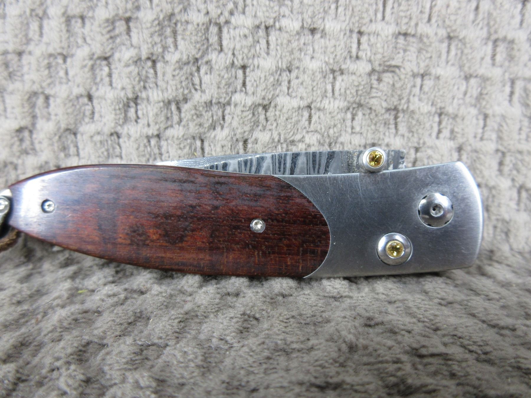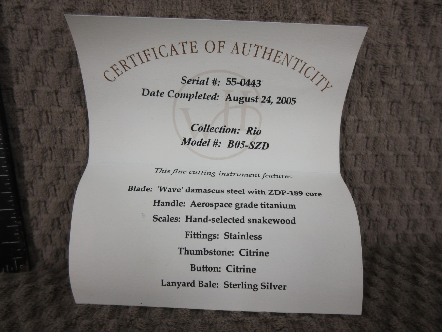 William Henry Folding Knife B05-SZD with Sheath - Rio Collection and has 2 citrine jewels one in blade one in handle and wood is snakewood, serial # 55-0443 on blade.