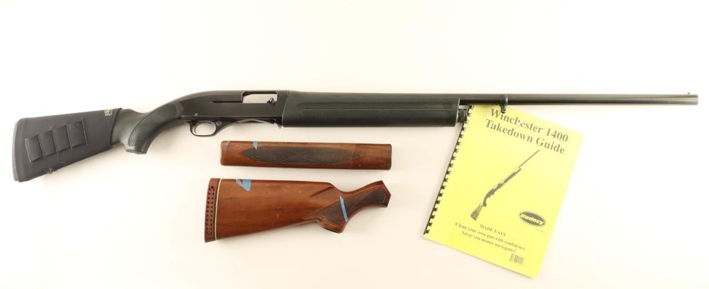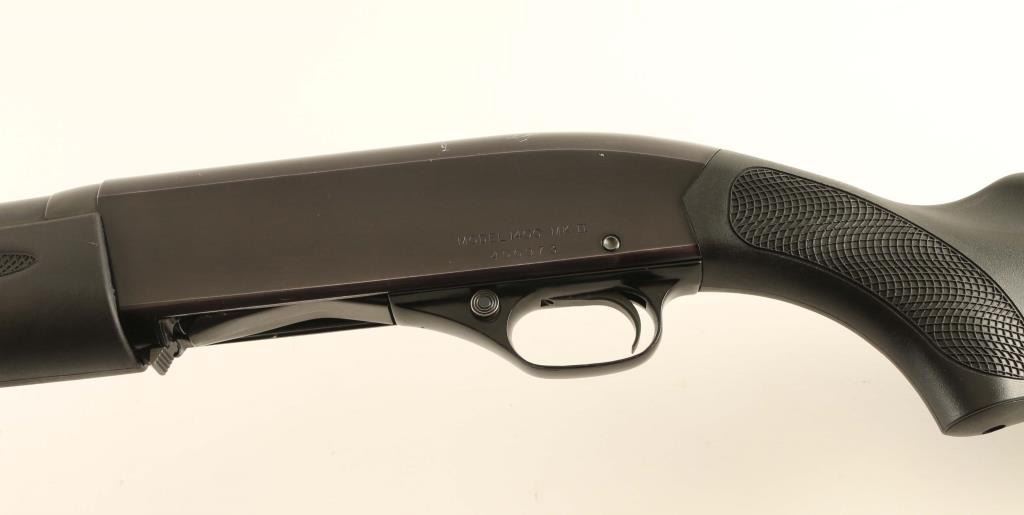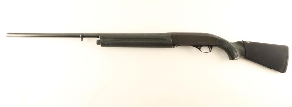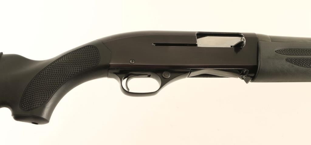 American made gas operated semi-automatic shotgun chambered for 2 3/4" 12 gauge shells. Features a blued 30" full choke barrel, Bradley style white bead front sight, 2 round magazine tube, smooth trigger with beveled trigger, alloy trigger guard with cross-bolt safety, polished bolt with smooth charging handle, black anodized aluminum receiver, installed swivel studs, textured black synthetic forend and semi-pistol grip shoulder stock with Beartooth slip-up cartridge carrier, rubber recoil pad & 14 ¾” LOP. Includes a set of wood stocks and a Radocy takedown guide. Shotgun retains approximately 85% of its original finish showing thinning, scattered wear and scratches. Action is sound, the bore is excellent and the synthetic stocks are fine. Condition is NRA Good. ***Modern Firearm***