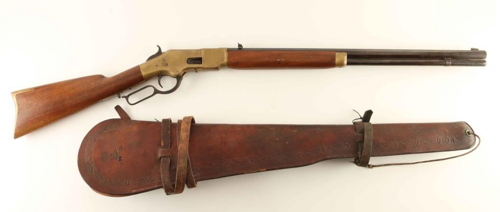 'Third Model, Yellow Boy' Desirable early brass frame lever action repeating rifle chambered in .44 Rimfire, manufactured circa 1868. The iconic 1866 was the first firearm to bear the Winchester name, it was produced in three different variations(carbine, rifle & musket), went through four model changes and production lasted from 1866-1898 with an estimated 170,101 rifles produced. The estimated number of Sporting Rifle configuration rifle produced is only 28,000, a mere 16.46% of the total production. This rifle features a 24 3/8" octagon barrel, full-length 17 round tubular magazine, dovetailed brass blade front sight, flip-up "L" shape dual leaf rear sight, brass frame, smooth trigger, knurled hammer spur, scalloped loading gate, smooth walnut semi-beavertail forend with brass cap and a straight grip shoulder stock with brass crescent buttplate. Includes a tooled brown leather rifle scabbard by Dave Shelley of Cody, Wyoming. The barrel is stamped "WINCHESTER'S-REPEATING-ARMS. NEW HAVEN. CT./KING'S-IMPROVEMENT-PATENTED-MARCH 29. 1866. OCTOBER 16. 1860" with the right edge marking 2" away from the receiver. The rifle displays an even dark brown patina on the barrel, a mottled brown patina on the magazine tube, a nicely aged brass patina on the receiver which shows scattered dings & soft edges. The action appears to be is in working order other that the lifter not traveling fully upward, the bore is good, the markings are very faint, and the wood later stocks are near fine. Condition is NRA Good. ***Antique Firearm***