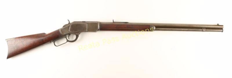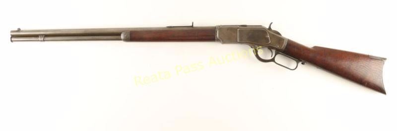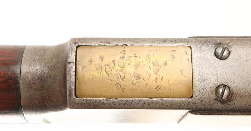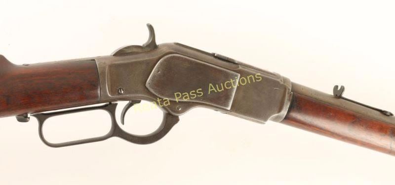 'Third Model' Vintage lever action repeating rifle chambered in .22 Short Rimfire, circa 1888. Features a blued finish, 24 7/16" King's Improvement round barrel, blade front sight, adjustable buckhorn rear sight(missing ramp), full length tube magazine, serrated finger guide dust cover, smooth trigger, checkered hammer spur, metal forend cap, smooth walnut forend and straight grip shoulder stock with crescent metal buttplate. Rifle exhibits traces of bluing on the side plates with the balance of the metal surfaces turned to nice even light grey patina. Action is smooth, bore is good with pitting & only light rifling and wood stock are near fine. Condition is good++. ***Antique Firearm***