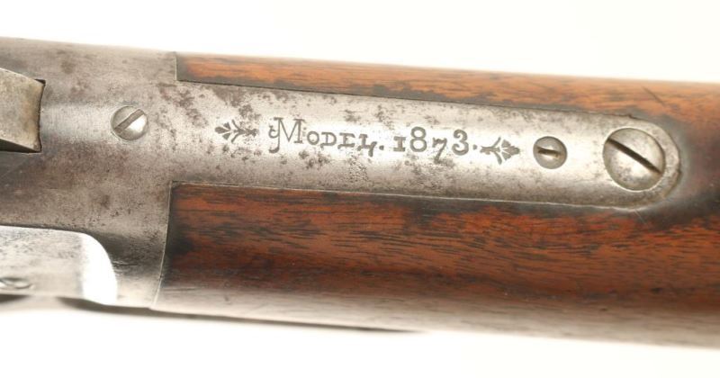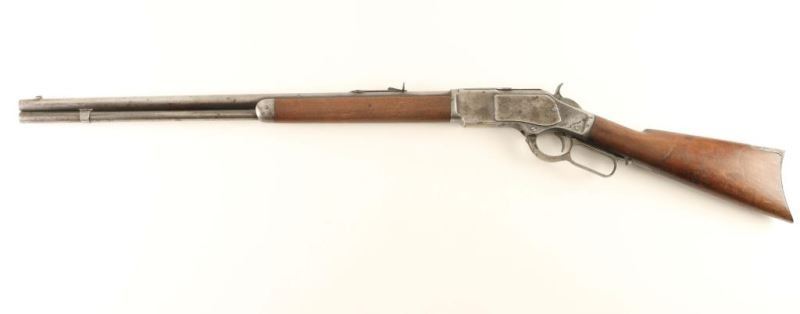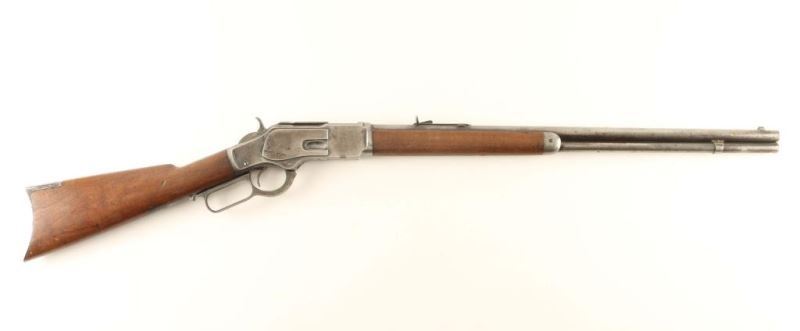 Antique lever action repeating rifle chambered in .38 W.C.F., manufactured in 1889. Features a blued finish, 24 5/16" King's Improvement barrel, full length tube magazine, dovetailed blade front sight, adjustable semi-buckhorn rear sporting sight, smooth trigger, knurled hammer spur, dust cover, smooth walnut forend with metal cap and straight grip shoulder stock with crescent metal trapdoor buttplate. Rifle exhibits some examples of bright bluing in protected areas with less that 10% intact overall. The majority of the metal surfaces are in-the-white and show some scattered dark oxidation and brown patina. Action is smooth, bore is fair to good, markings are good and the wood stocks are good to very good. Condition is NRA good+. ***Antique Firearm***