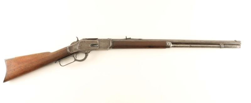 Third model, circa 1893. 24 5/16" King's Improvement octagon barrel, full length tube magazine, low-profile blade front sight, semi-buckhorn adjustable rear sporting sight, dust cover, smooth walnut stocks and crescent metal trapdoor buttplate. Rifle exhibits a brown patina showing scattered spots of dark rust and some dents in the magazine tube & forend cap. The end of the magazine tube is missing to cap and appears to be filled in with lead or another metal. Markings are very good, action is smooth, bore is near good with some pitting & a dark spot on the left side near the muzzle. Wood stocks have good fit and are in near good condition showing a crack extending from the metal cap on the bottom of the forend, some small losses and minor cracks on both sides of the wrist. Condition is good. ***Antique Firearm***
